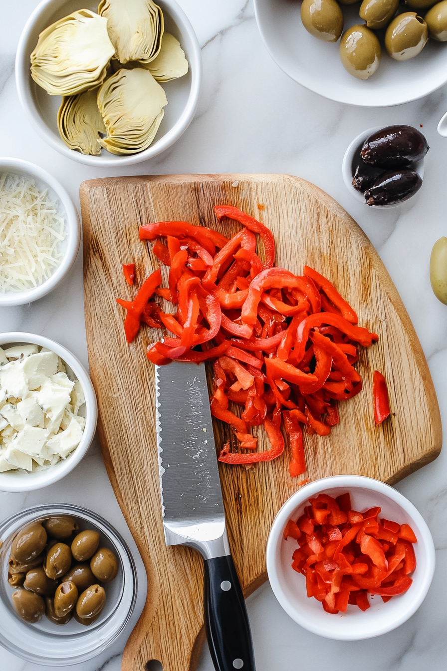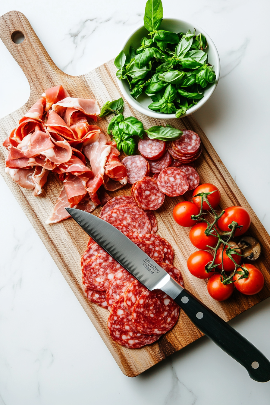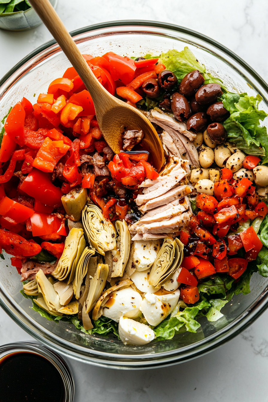 Thinly slice meats, cheeses, artichokes, roasted red peppers, and romaine. Roll and slice meats and cheeses into ribbons.