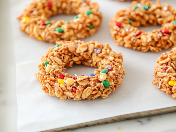 Grease your hands with butter or cooking spray (or wet them with water) and shape each dollop into a wreath.