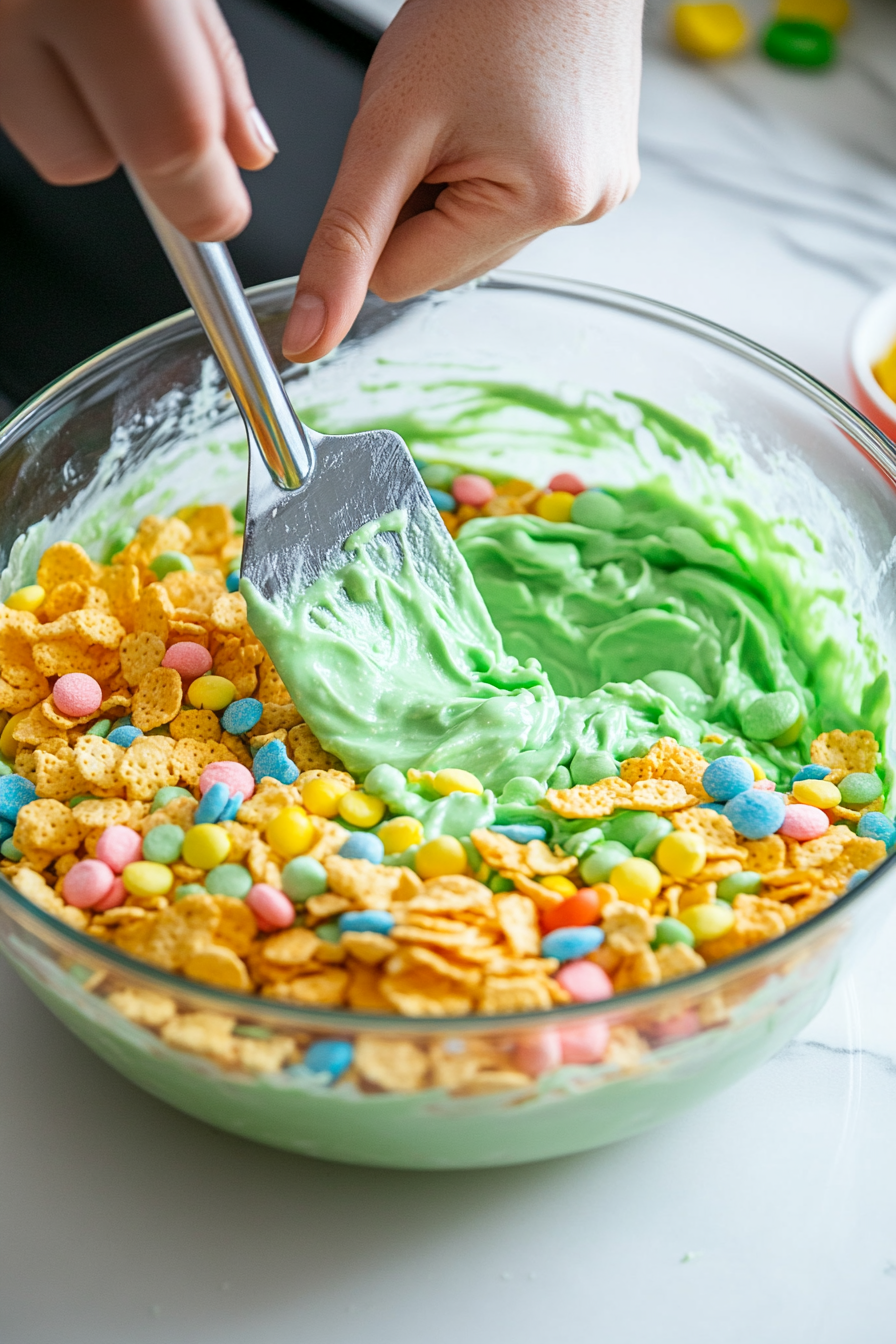 Pour the melted marshmallow mixture over the cornflakes and stir to coat evenly.