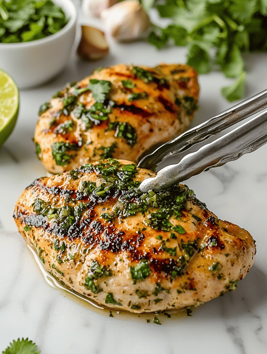 This dish features tender chicken marinated in a zesty lime juice with fresh cilantro, then grilled until slightly charred with a juicy interior. The final presentation showcases vibrant green herbs and glistening, flavorful meat with a smoky exterior and moist, tender texture.