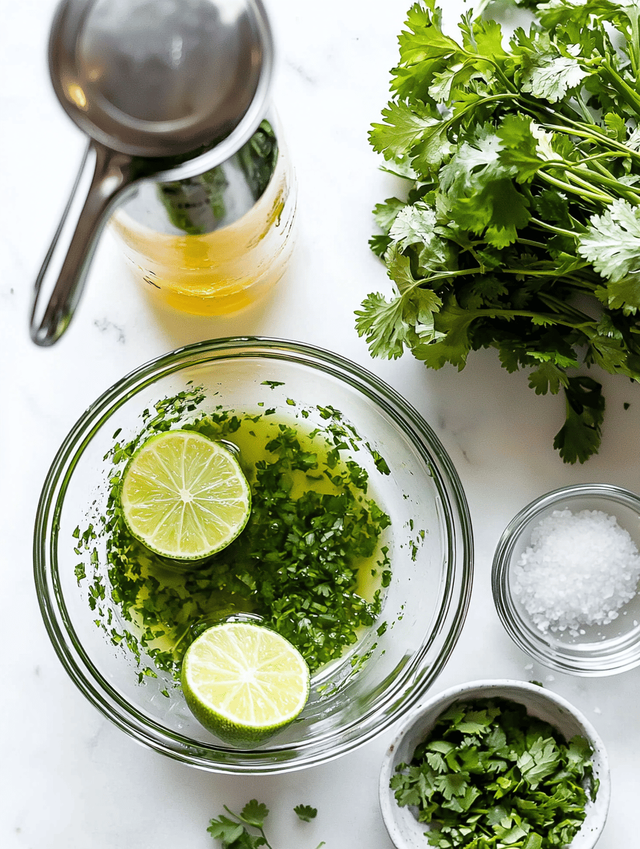 • Slice one lime in half and juice all three limes into a large bowl, then add the minced garlic, chopped cilantro (set aside some for garnish), olive oil, salt, and pepper. Whisk together until well combined to create a vibrant marinade base.