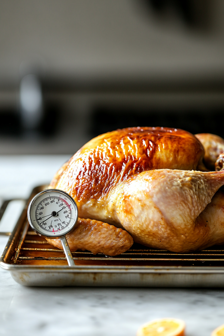 Use a meat thermometer to check for doneness; the internal temperature should reach 75°C (165°F). The skin should be golden brown and crispy.