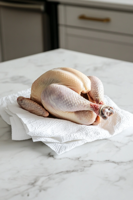 Pat the chicken dry with paper towels, both inside and out, to help achieve crisp skin.