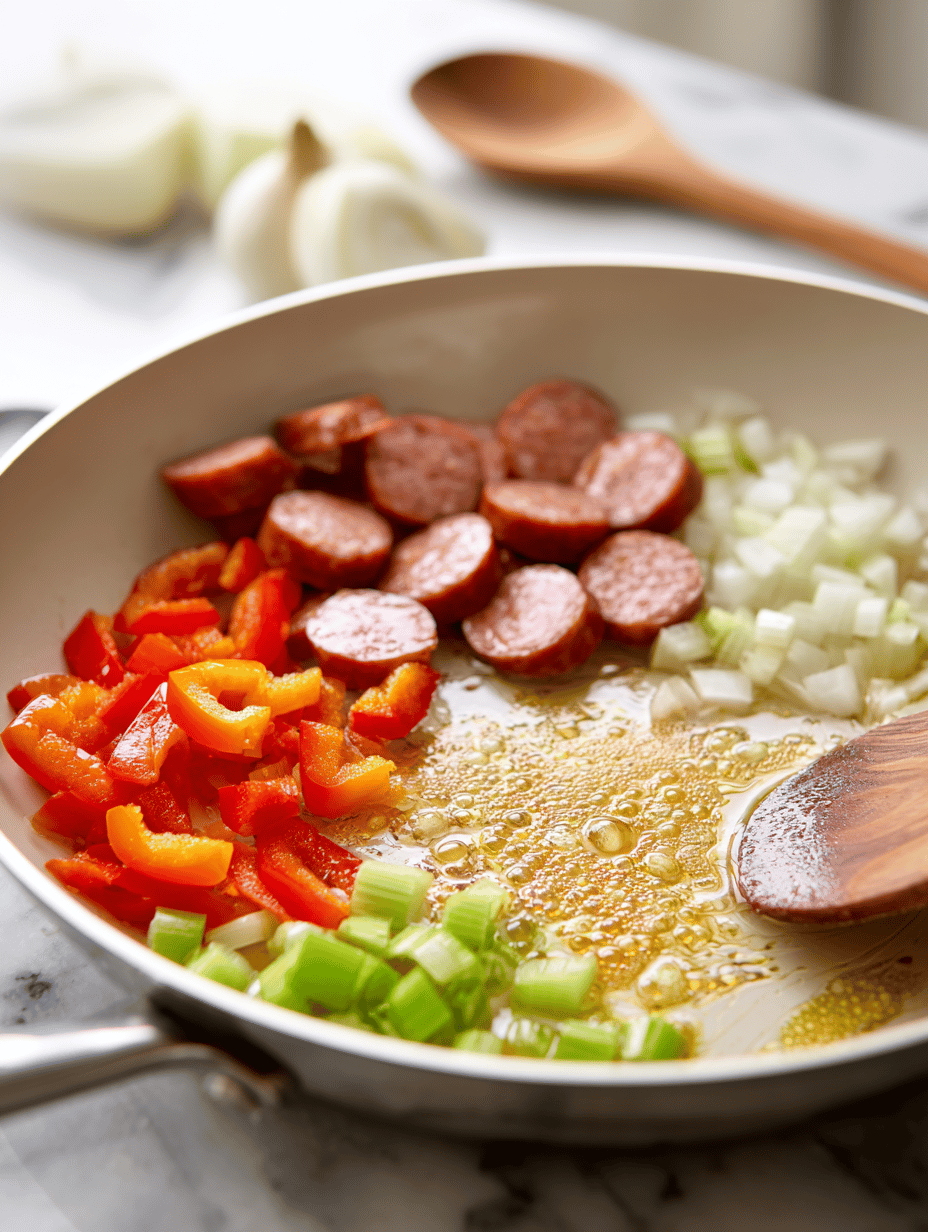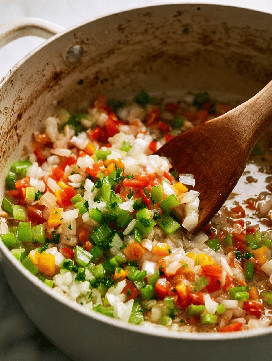 In the same pot, toss in diced onions, chopped celery, and chopped bell peppers. Cook for about 5 minutes, stirring often, until the vegetables soften and the mixture turns fragrant with a sweet smoky aroma.