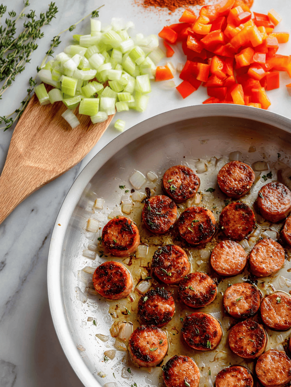 Add sliced sausage to the pot and cook for 5-7 minutes, stirring occasionally, until browned and slightly crispy. Transfer to a plate and set aside.