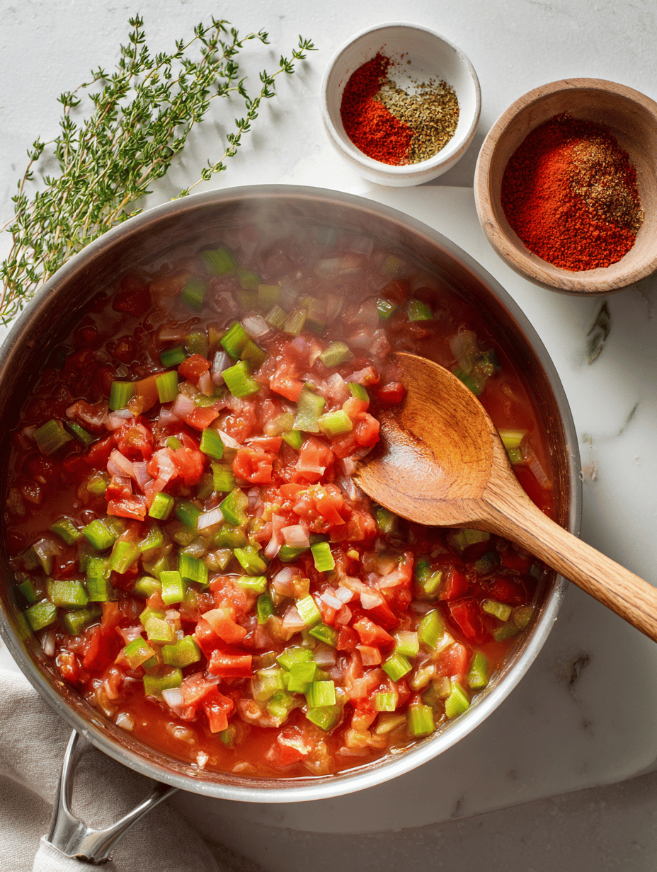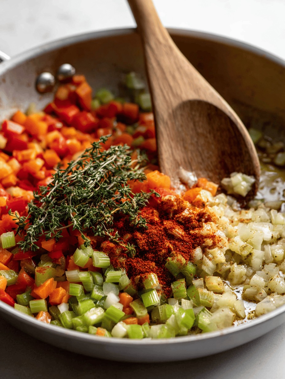 Add minced garlic, smoked paprika, cayenne, and thyme. Stir well and cook for about 1 minute until the spices bloom and fill the air with a rich aroma.