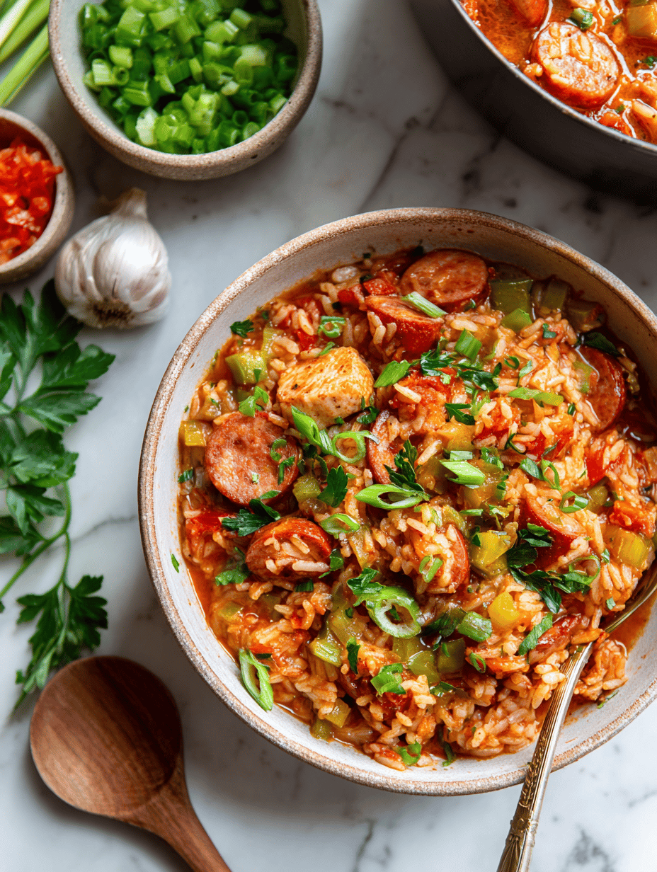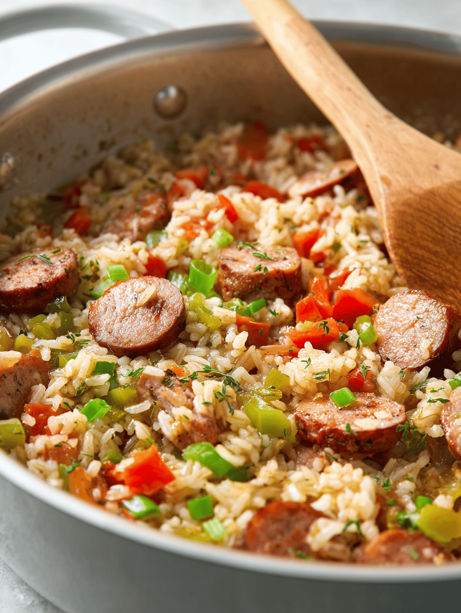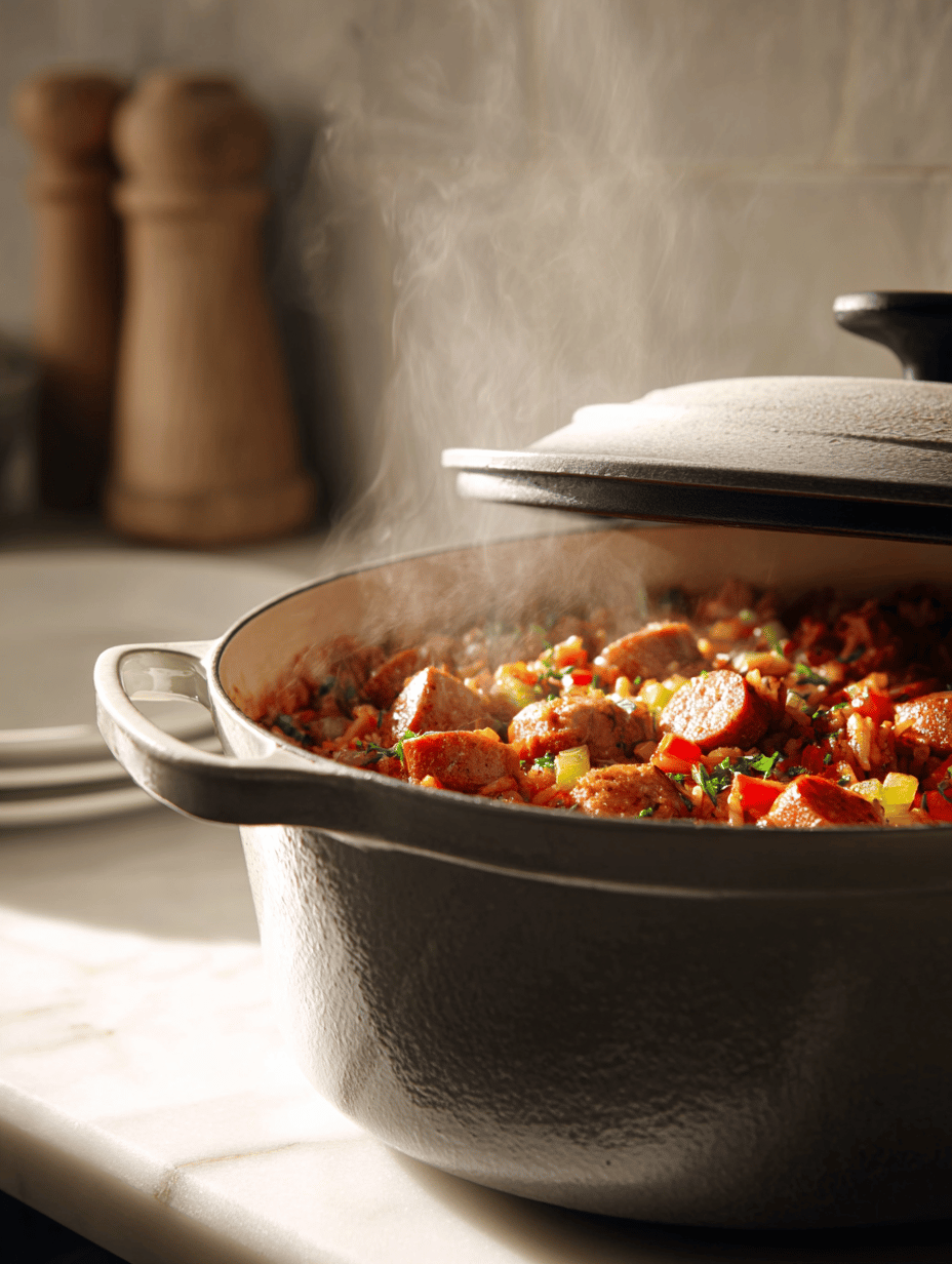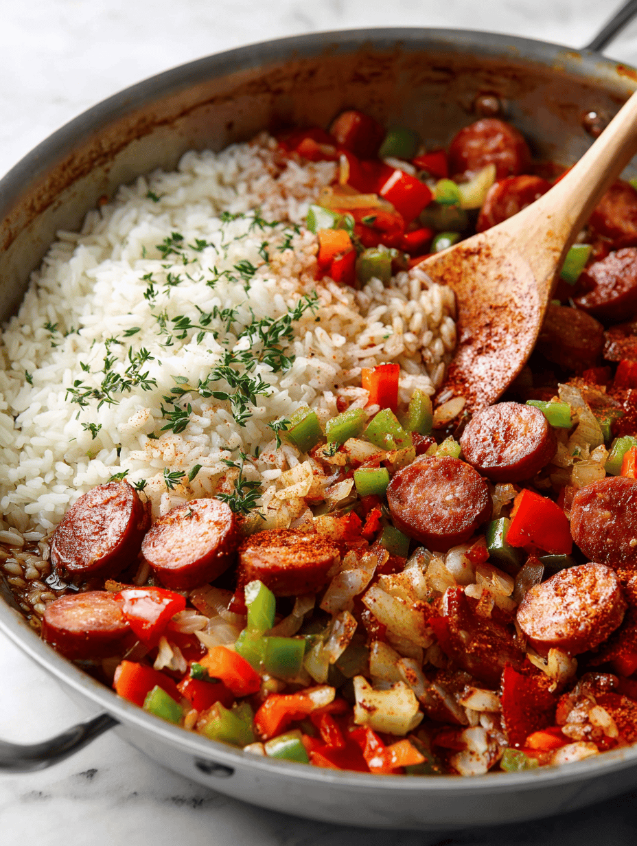 This hearty one-pot dish combines smoky sausage, colorful bell peppers, and tender chicken with aromatic spices, all simmered with rice until perfectly tender. The final result is a vibrant, flavorful dish with a slightly smoky aroma and a comforting, slightly moist texture that’s packed with bold flavors and textures.