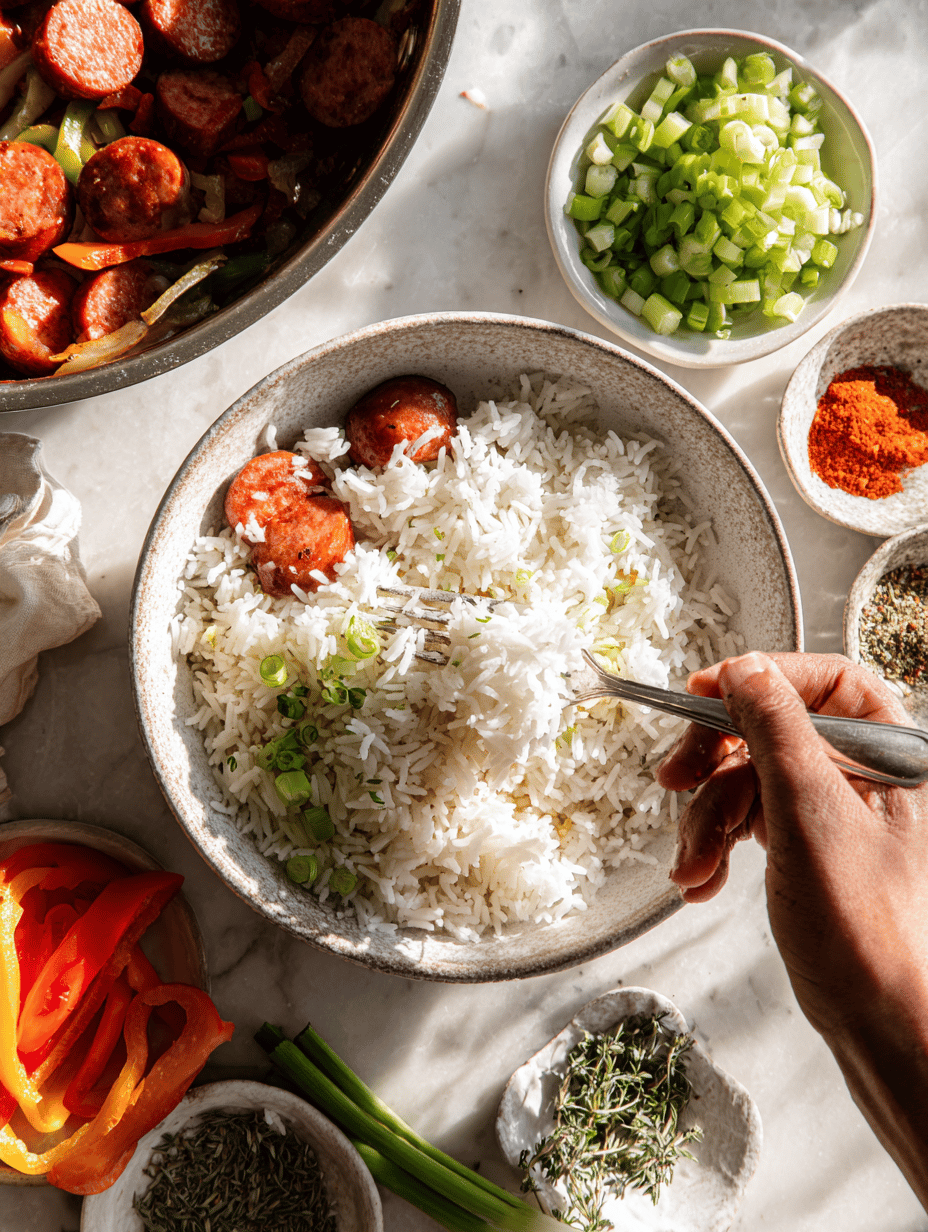 Fluff the rice with a fork to aerate it, then fold in the cooked sausage. Taste and adjust seasoning with salt and pepper as needed.