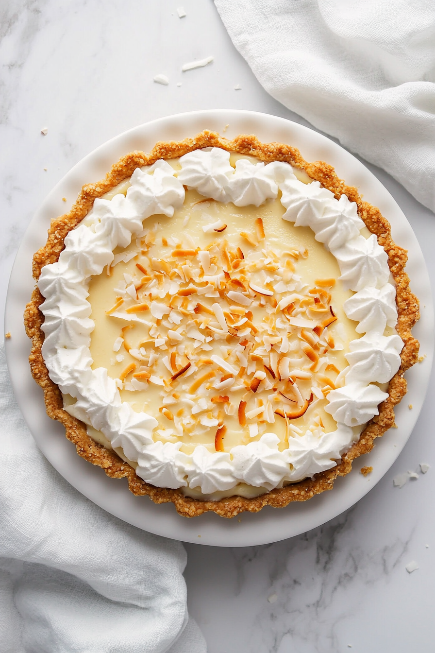 Beat whipping cream with powdered sugar until stiff. Spread over the pie and top with coconut flakes. Enjoy!