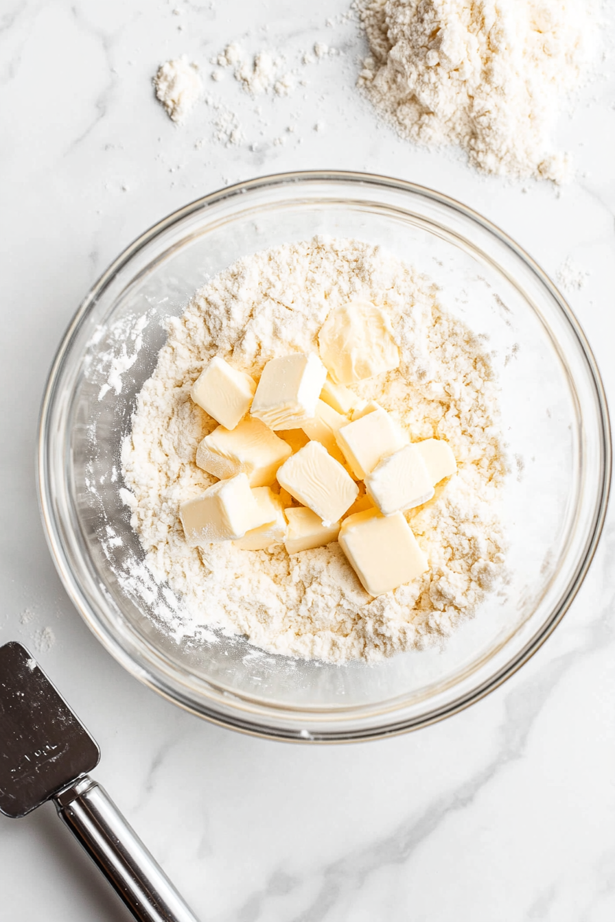 Mix flour, salt, sugar, and butter until crumbly. Add ice water and form a dough.