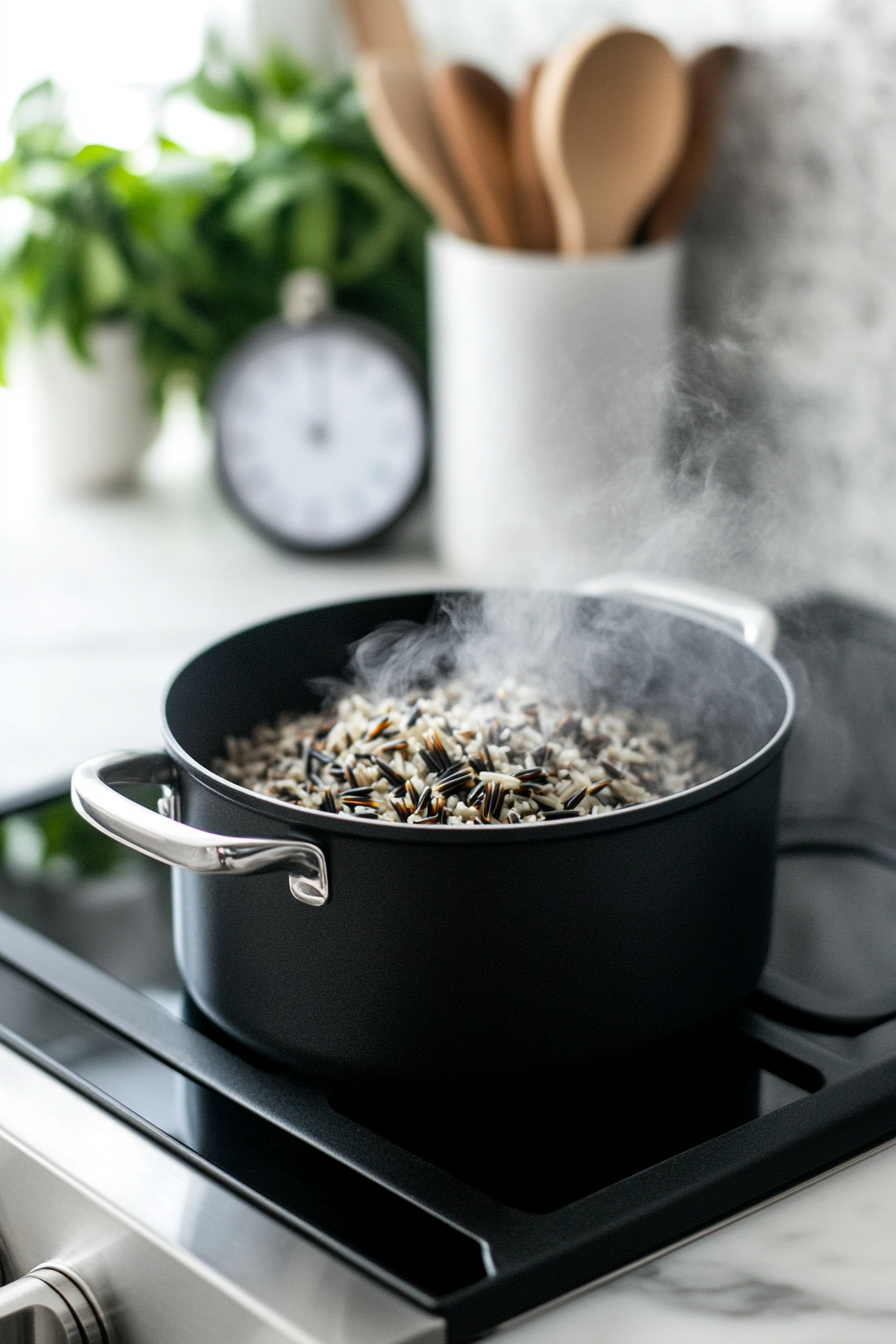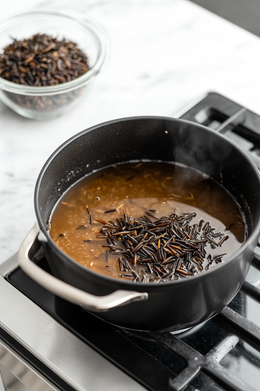Add wild rice, reduce to a simmer, cover, and cook for 45-50 minutes, until al dente. Fluff with a fork and set aside.