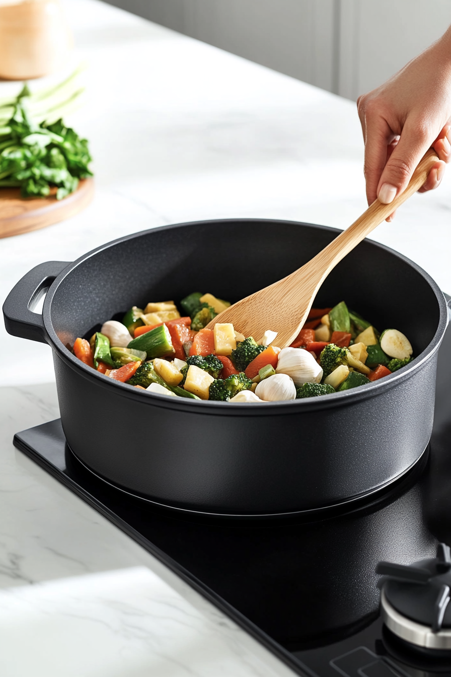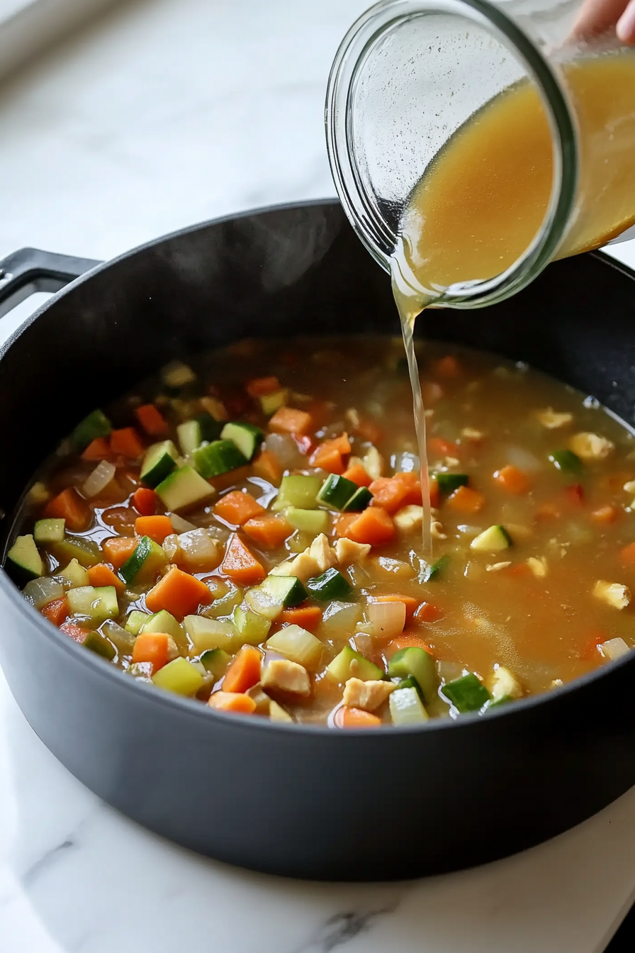Sprinkle flour over the veggies and stir for 3 minutes to create a roux.