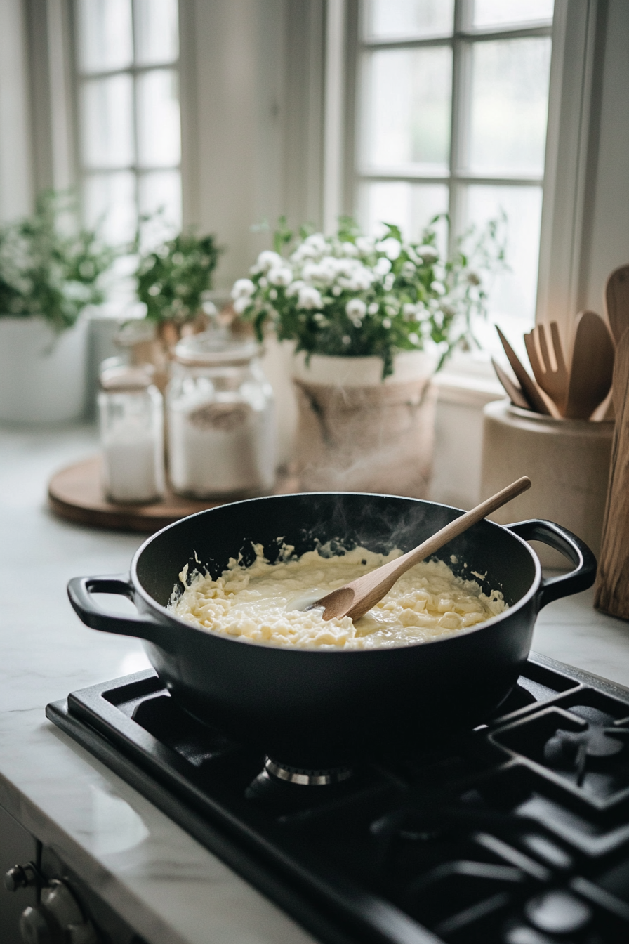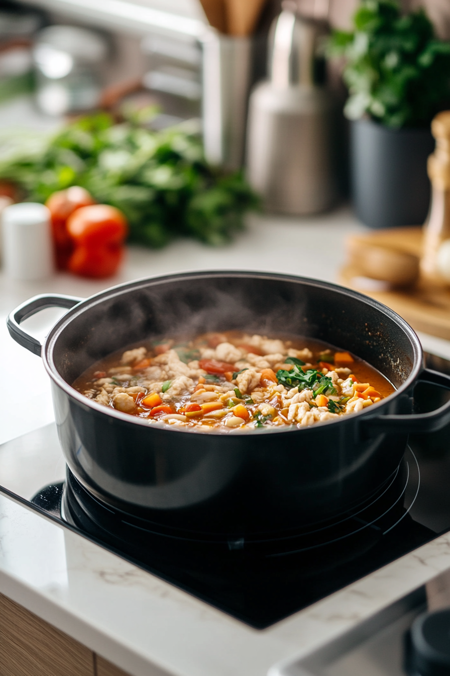 Gradually add 8 cups of chicken broth, stirring constantly. Bring to a boil, then reduce to a simmer for 15-20 minutes until thickened.