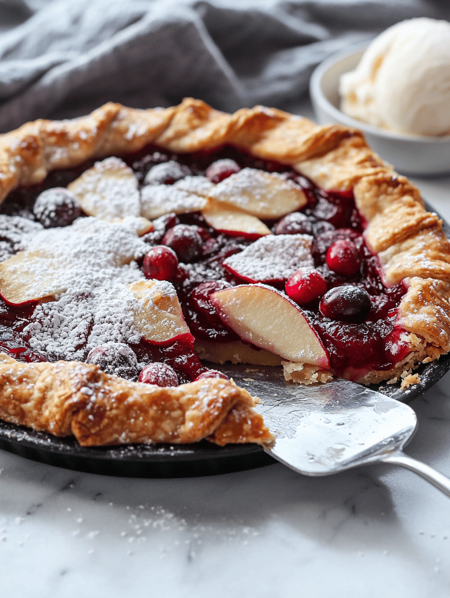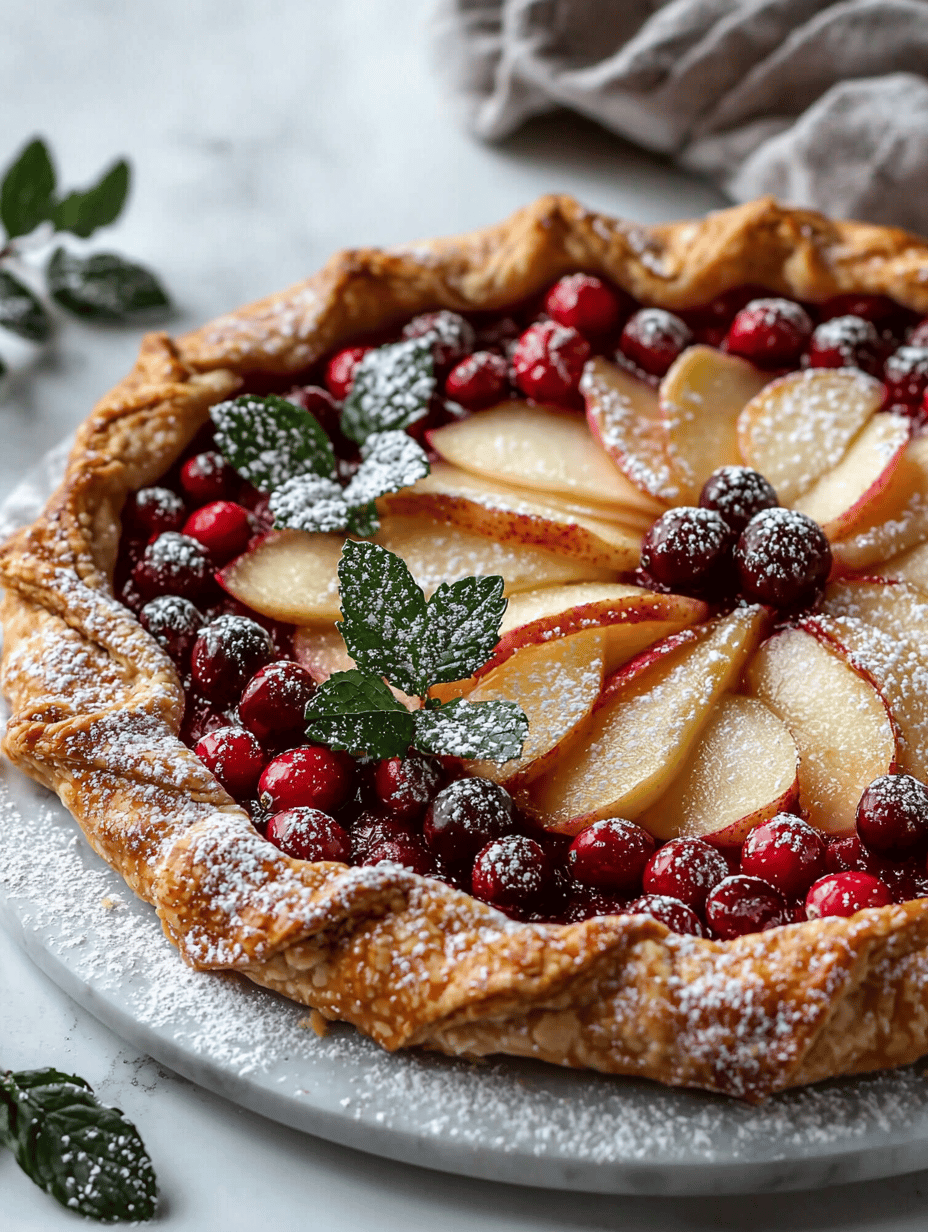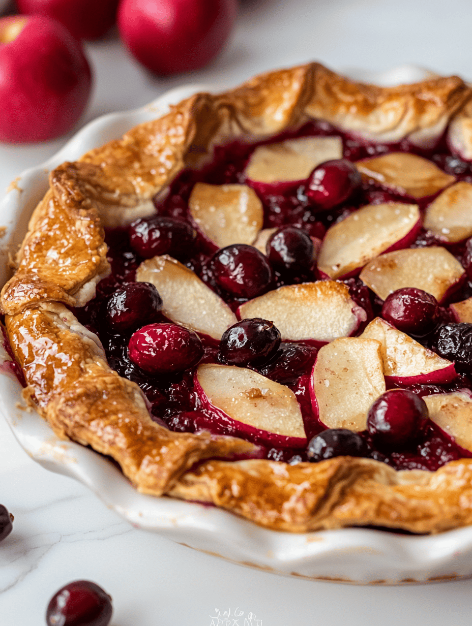 The Cranberry Apple Galette is a rustic tart that features thinly sliced apples and vibrant cranberries nestled inside a flaky, golden crust. The dish is assembled by folding the dough edges over the fruit filling and baked until bubbly and crisp, with a tender interior and slightly caramelized edges.