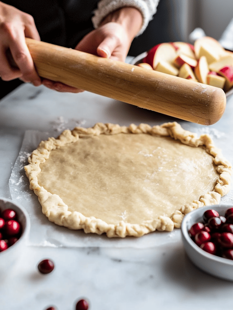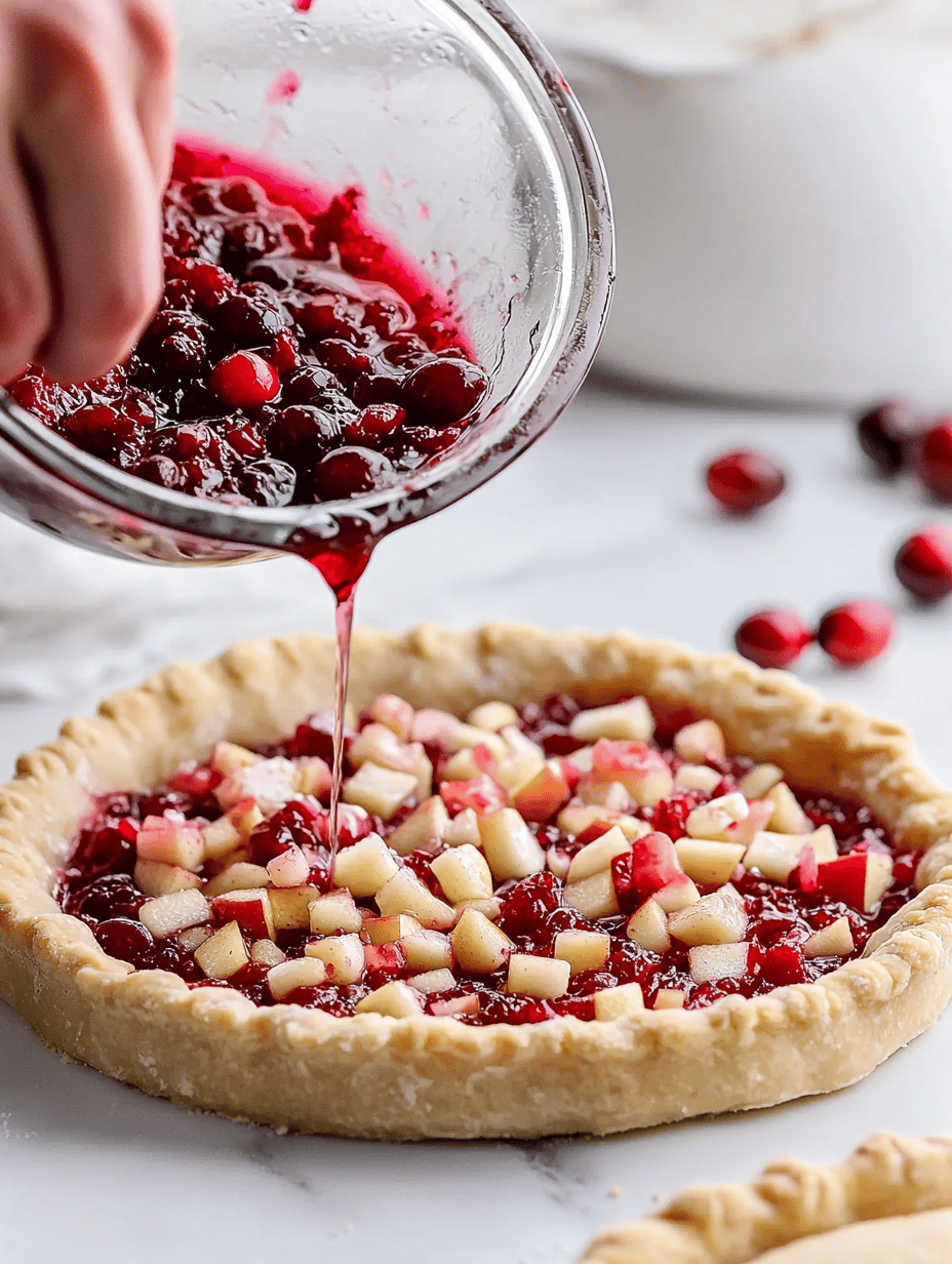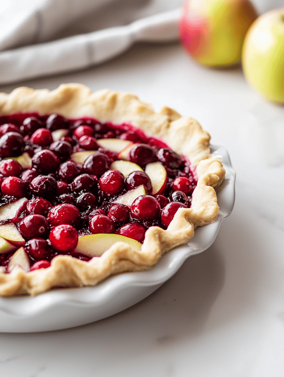 The Cranberry Apple Galette is a rustic tart that features thinly sliced apples and vibrant cranberries nestled inside a flaky, golden crust. The dish is assembled by folding the dough edges over the fruit filling and baked until bubbly and crisp, with a tender interior and slightly caramelized edges.