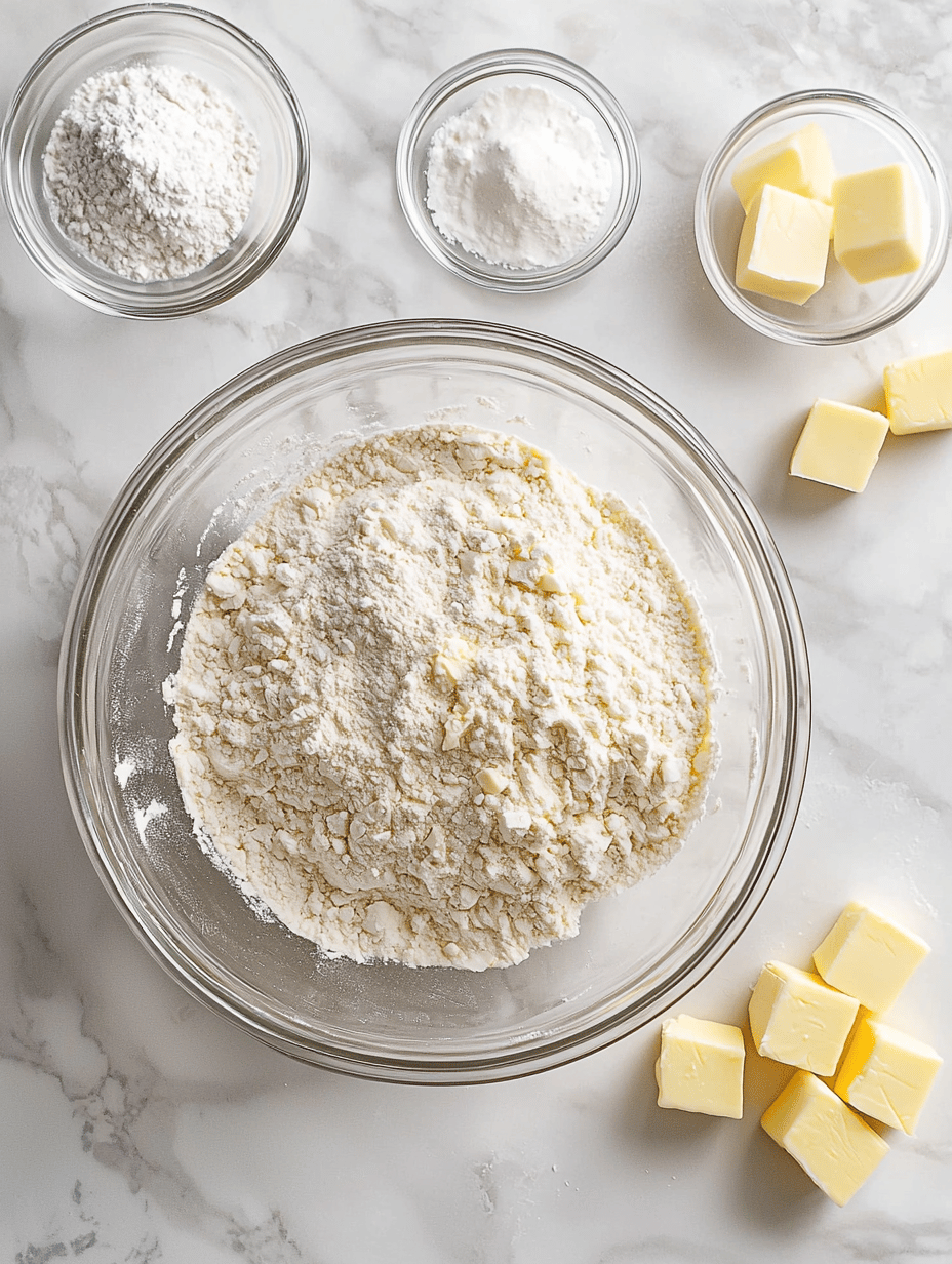 Combine flour, sugar, and salt in a mixing bowl. Add the cold butter cubes and use a pastry cutter or fingertips to cut in until the mixture resembles coarse crumbs.