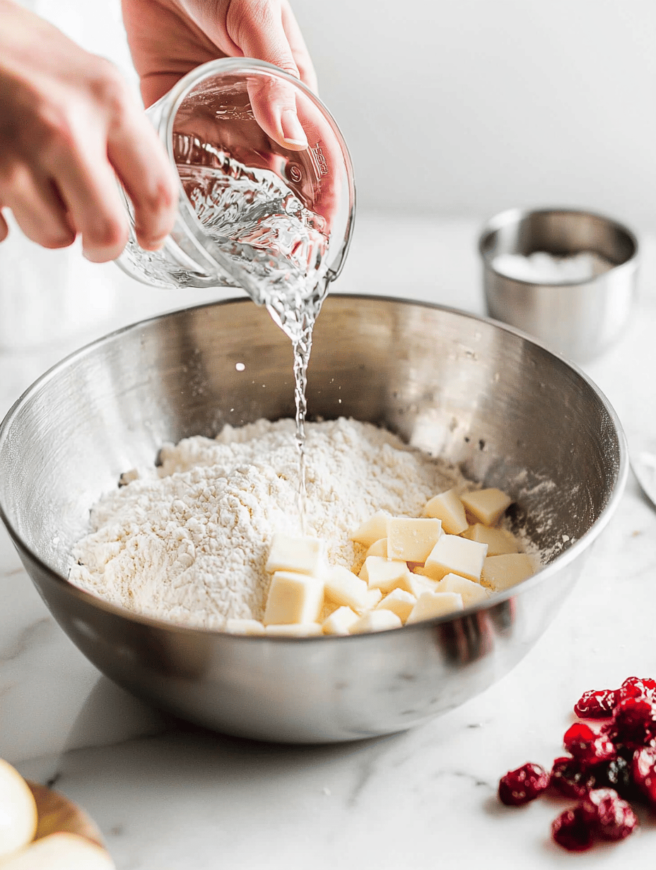 Gradually sprinkle in ice water, one tablespoon at a time, mixing gently until the dough begins to clump together but is not wet or sticky.