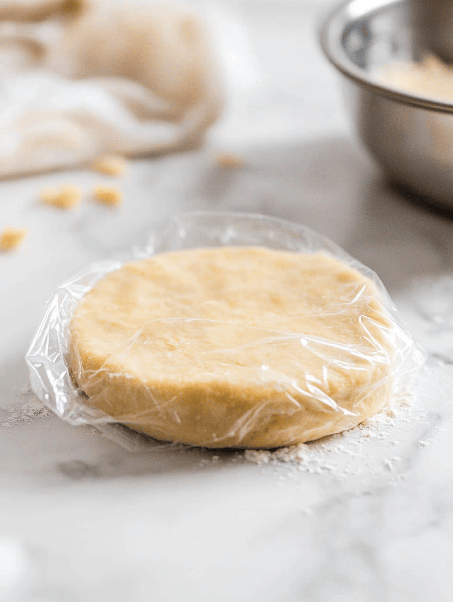 Gather the dough into a disk, wrap it in plastic wrap, and refrigerate for at least 30 minutes to relax the gluten and chill the butter.