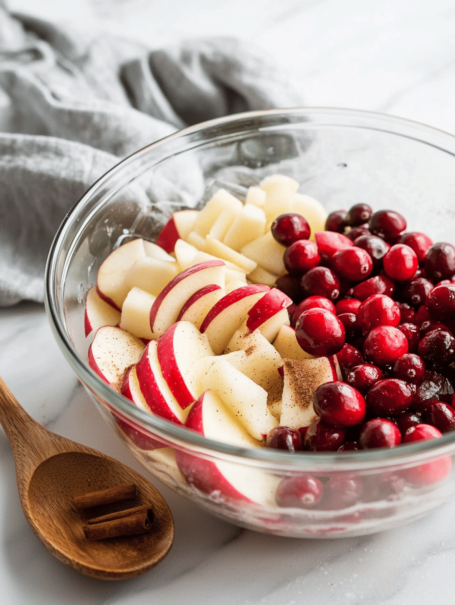 Peel, core, and thinly slice the apples. Toss the slices in a bowl with sugar, cinnamon, vanilla, and cranberries, letting the flavors meld slightly.