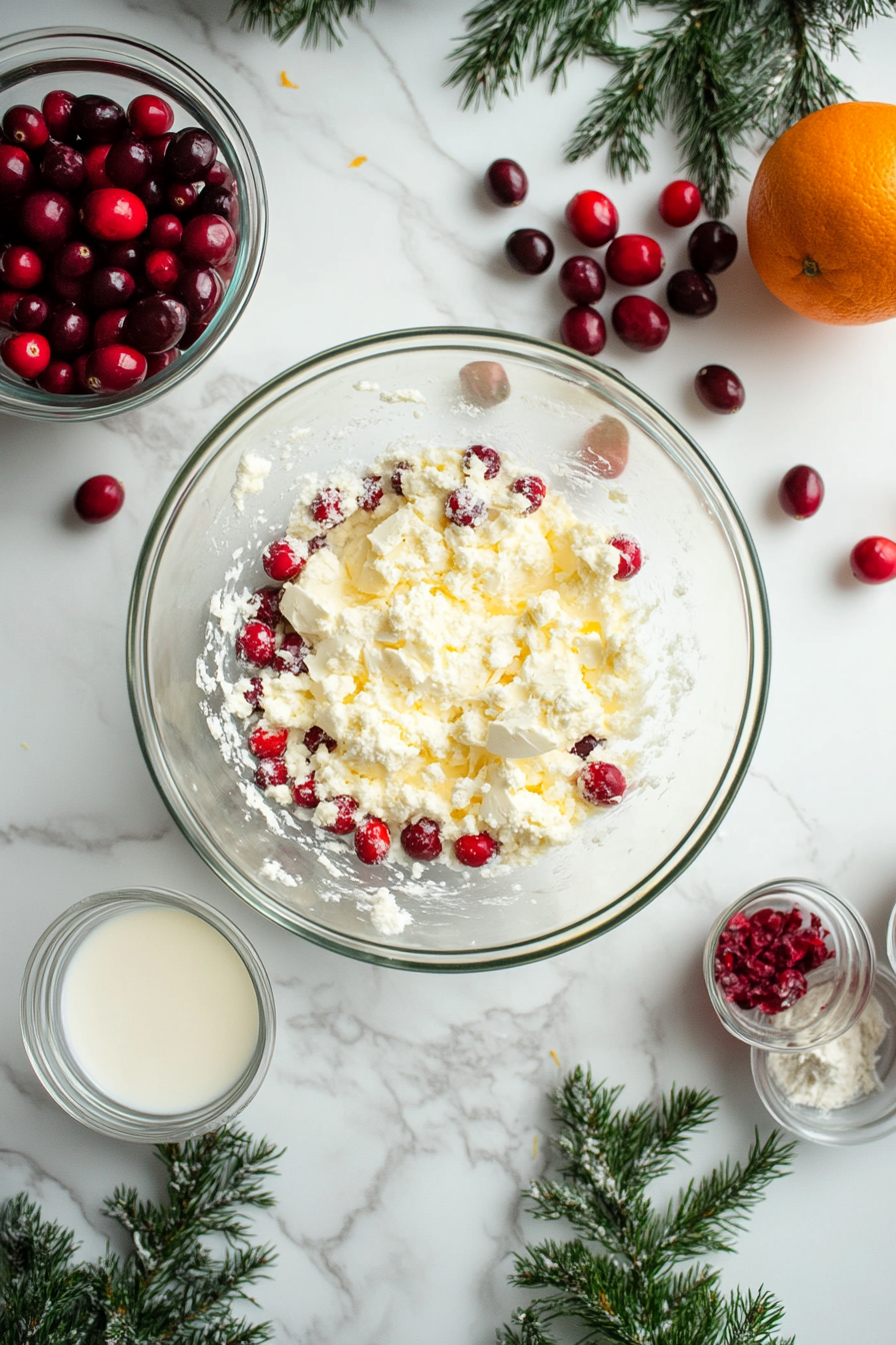 Combine flour, baking powder, and salt in a separate bowl. Gradually alternate mixing the dry ingredients and milk into the butter mixture, starting and ending with the dry ingredients. Add orange zest and fold in cranberries.