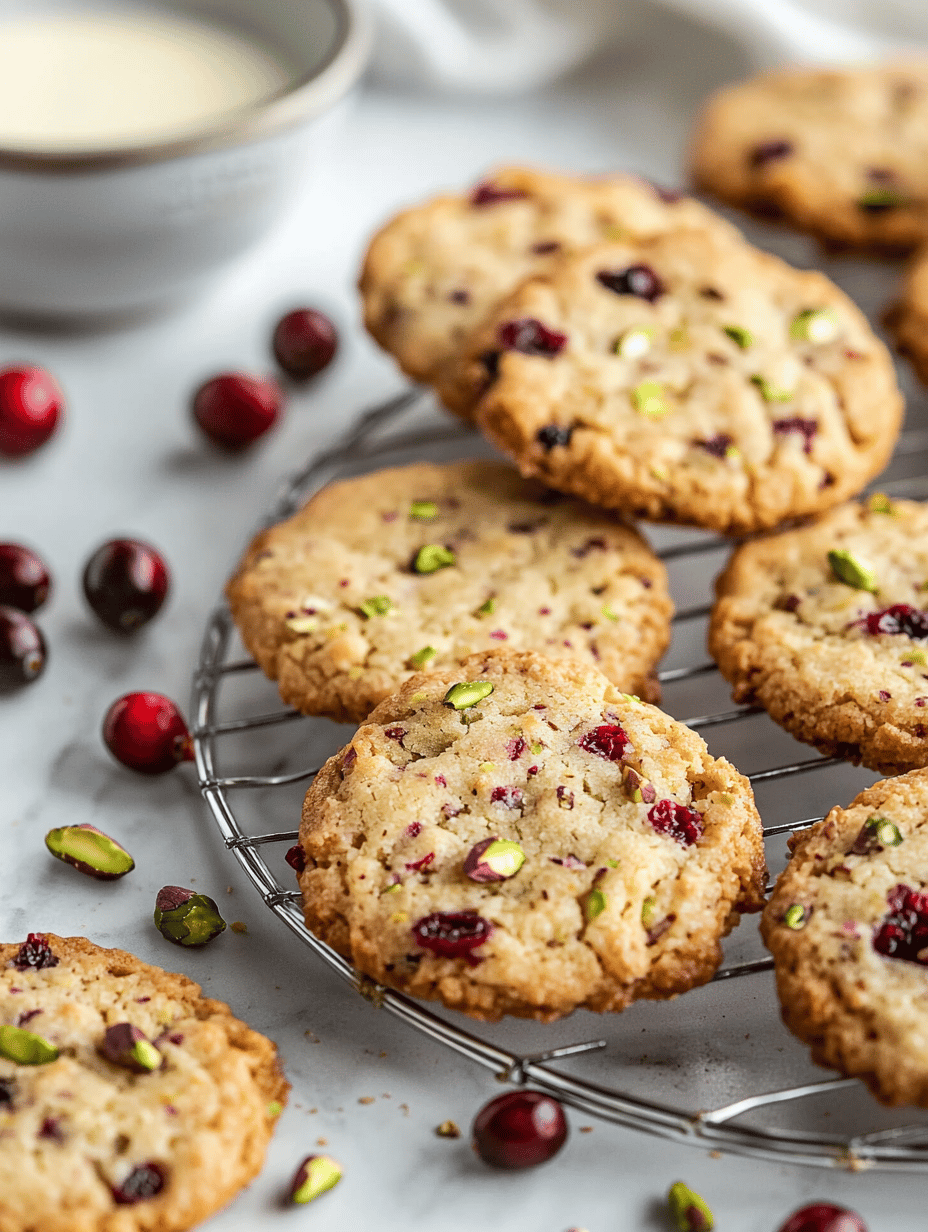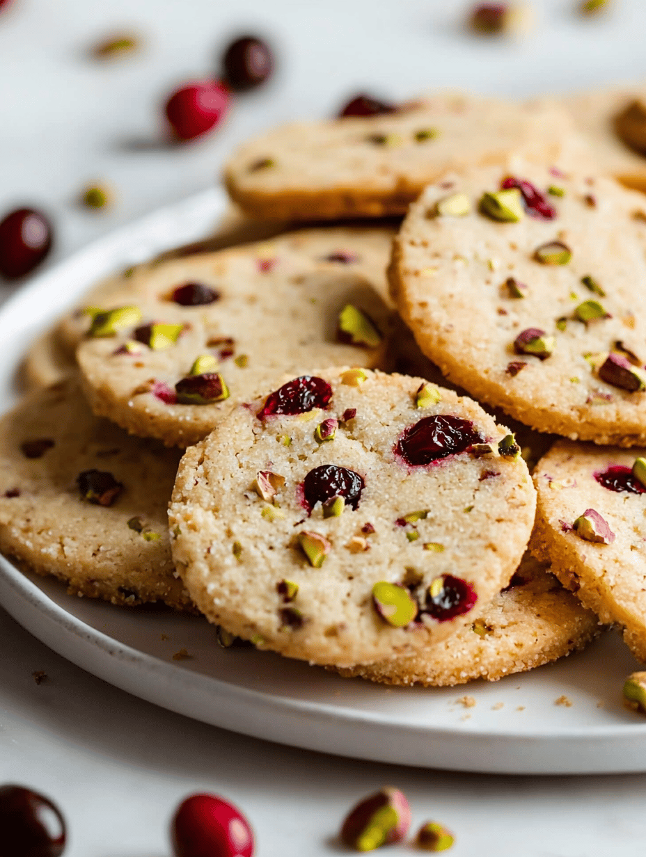This recipe produces tender, buttery shortbread cookies filled with tart cranberries and crunchy pistachios. The dough is mixed, shaped, and baked until golden, resulting in cookies with a delicate crumb, colorful specks, and a satisfying crunch with every bite.