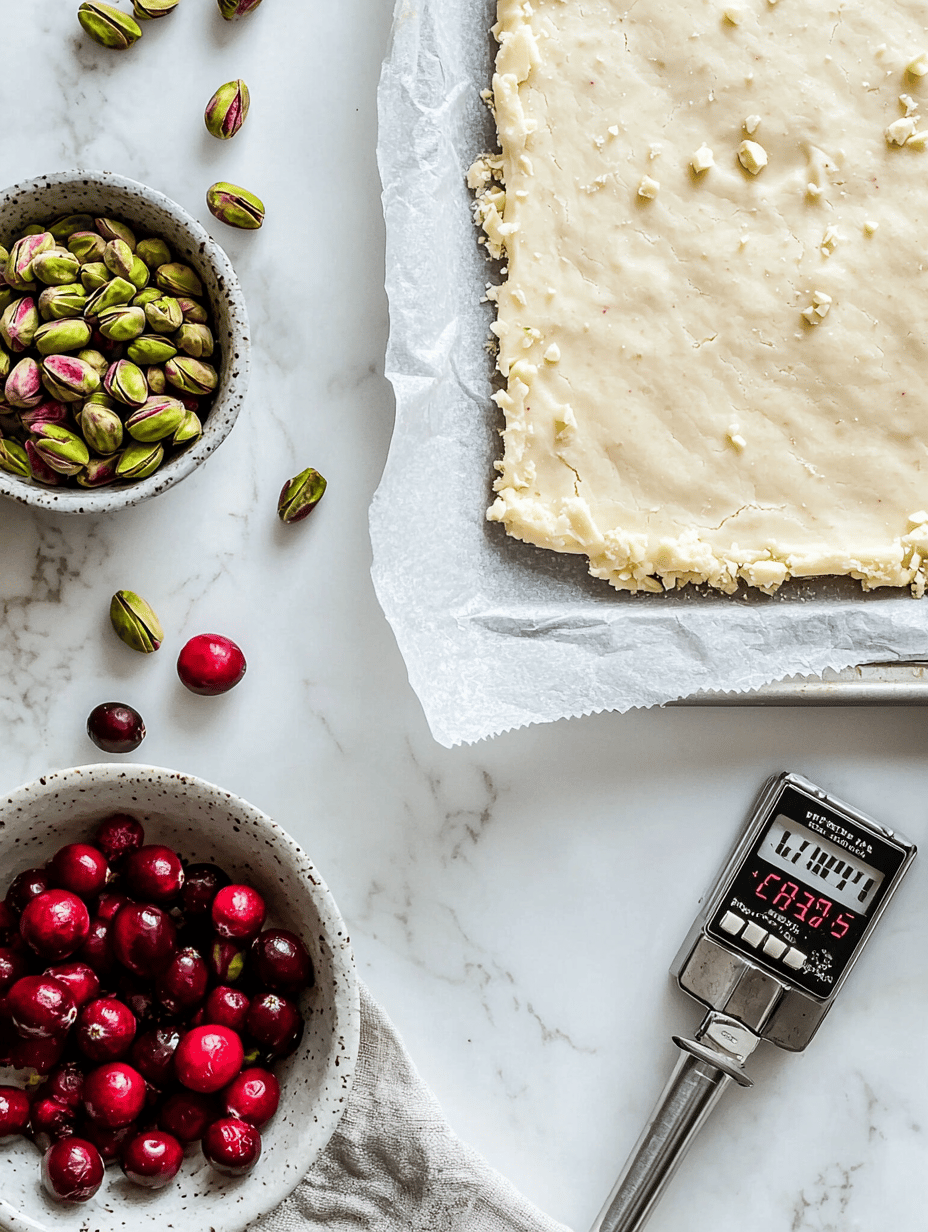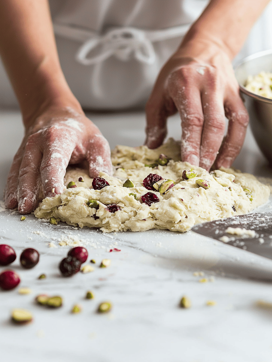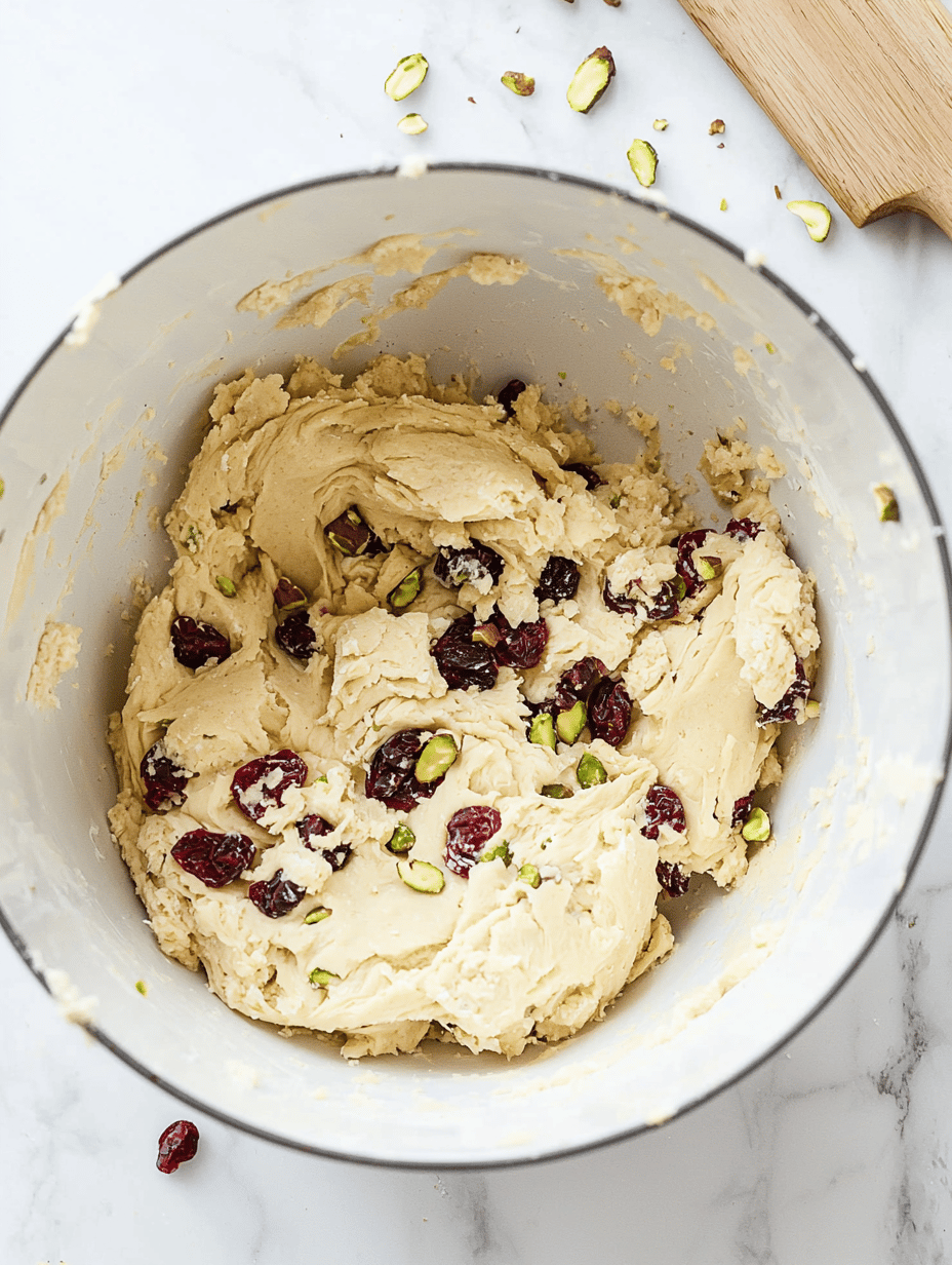 Gently fold in the chopped cranberries and pistachios, distributing them evenly throughout the dough.