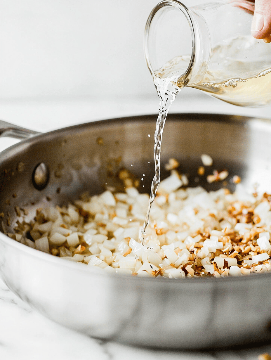 Pour in the white wine to deglaze the pan, scraping up any browned bits from the bottom. Let the wine simmer and reduce by half, which takes about 3-4 minutes, intensifying the flavor.