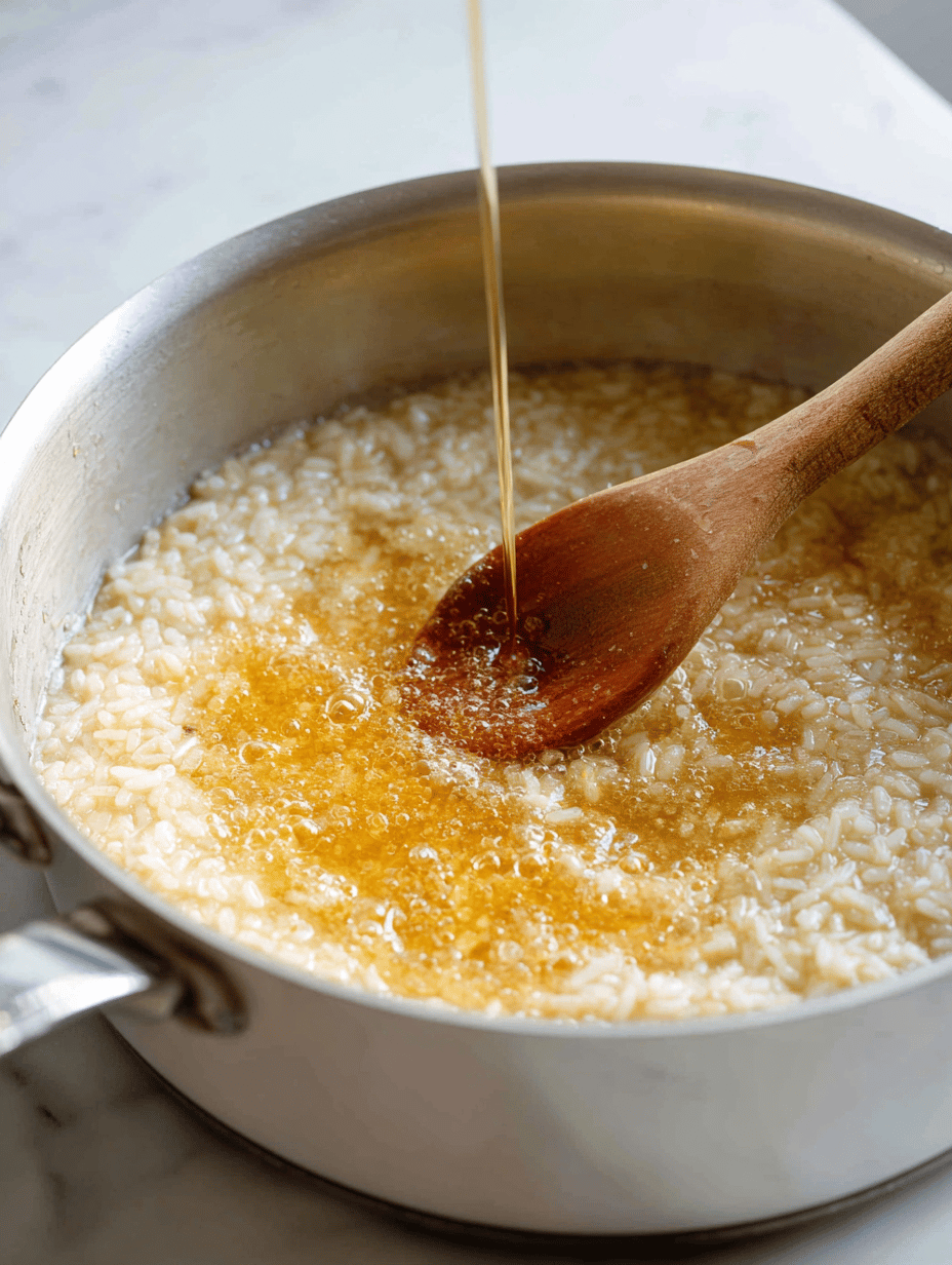 Pour in the white wine and cook, stirring until the liquid is mostly evaporated, about 2 minutes. This adds a bright, tangy flavor to the risotto.