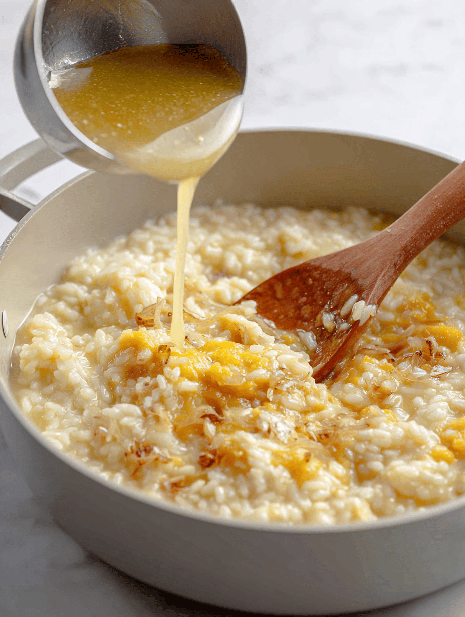 Stir in the pumpkin puree, allowing it to heat through and mingle with the rice. The mixture will become a vibrant orange and smell sweet and earthy.