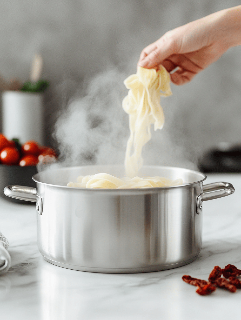 Luxuriously creamy pasta made with sun-dried tomatoes and vegan staples, creating a dish that is comforting and full of flavor.