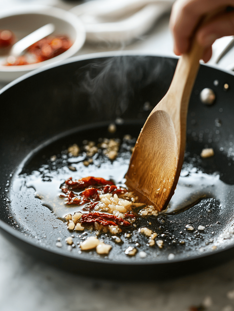 While the pasta cooks, heat olive oil in a pan over medium heat. Add minced garlic and sauté until fragrant.