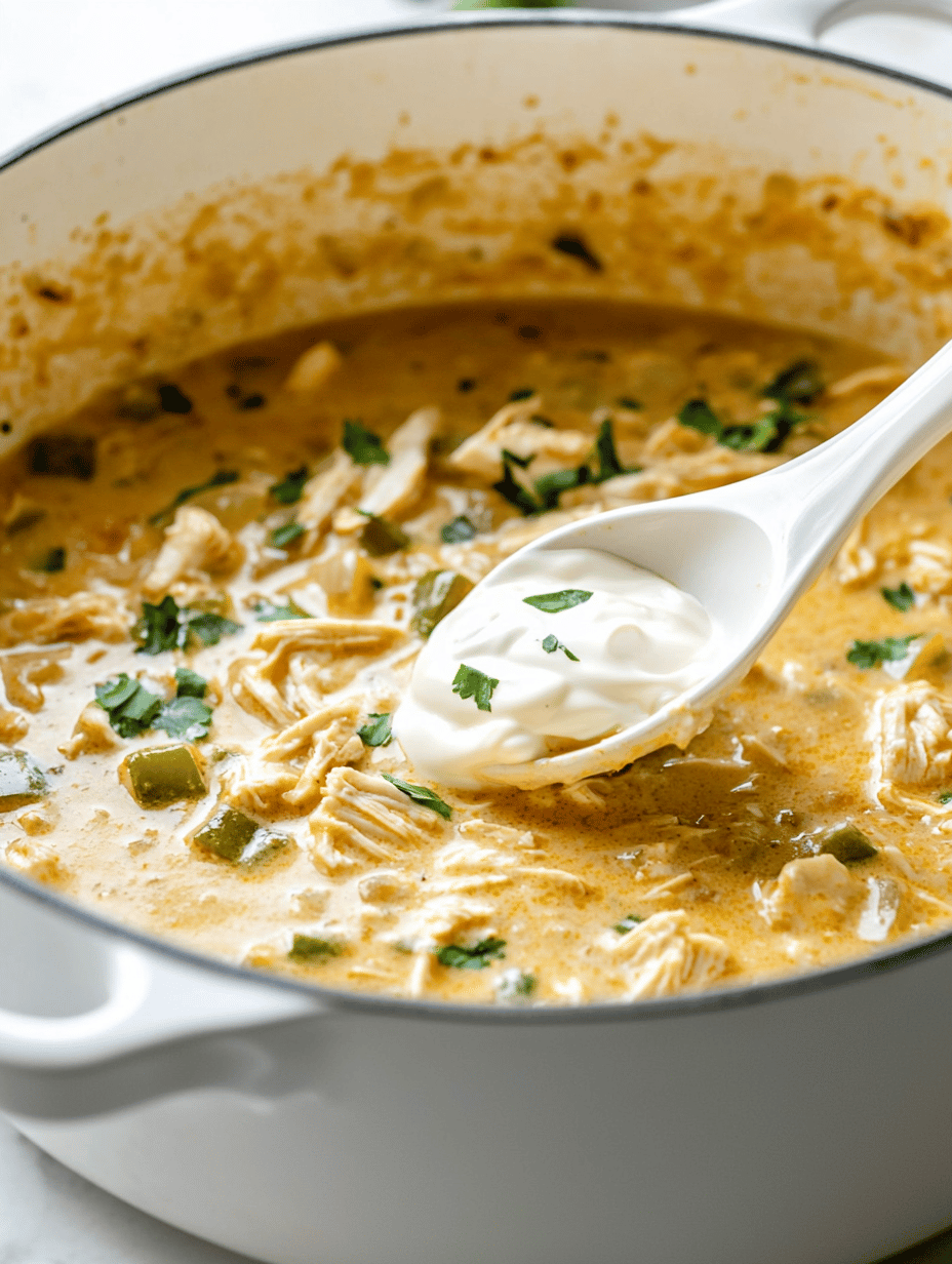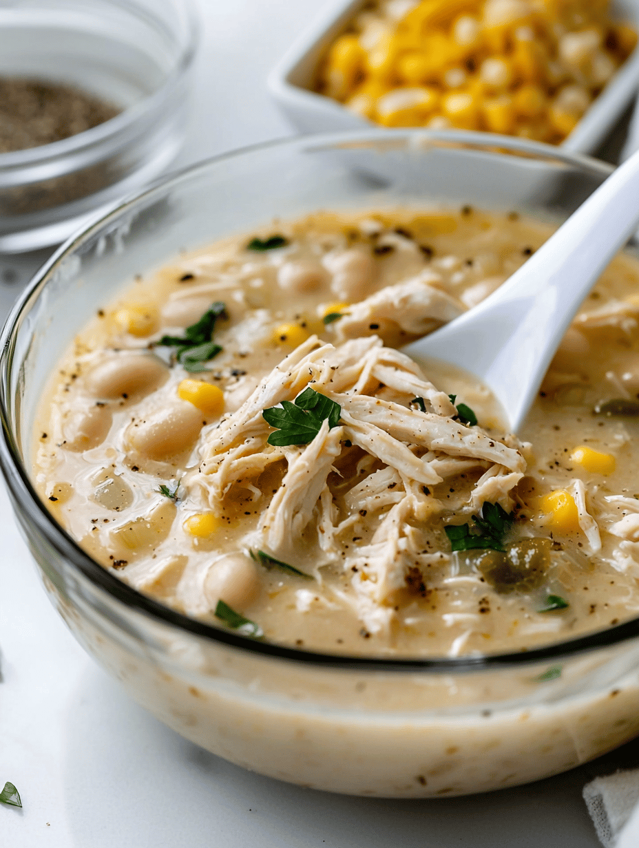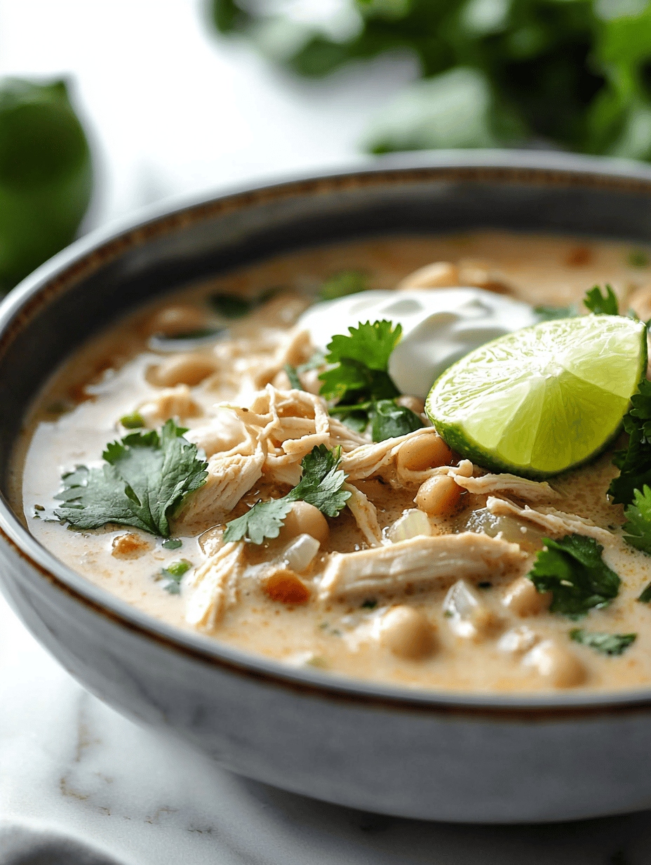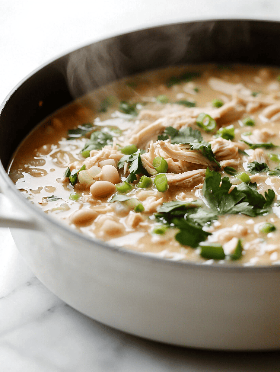 This white chicken chili combines tender shredded chicken, beans, and a rich, creamy broth seasoned with cumin and roasted garlic. It has a smooth, thick consistency with a comforting and subtly warming flavor profile, perfect for cozy meals and chilly days.