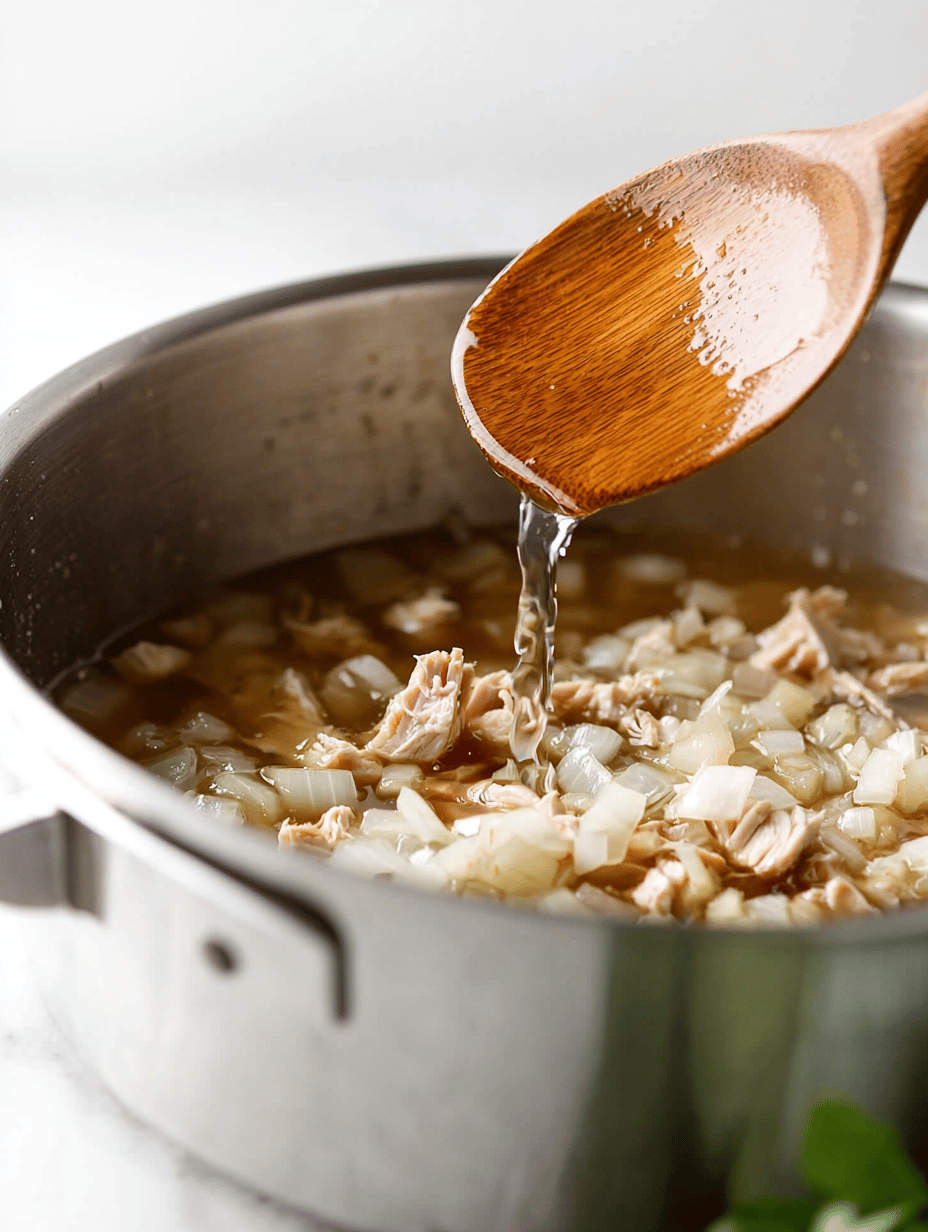 Pour in the chicken broth and bring it to a gentle simmer. If using dried beans, add them now; if using canned beans, add them later to prevent overcooking.