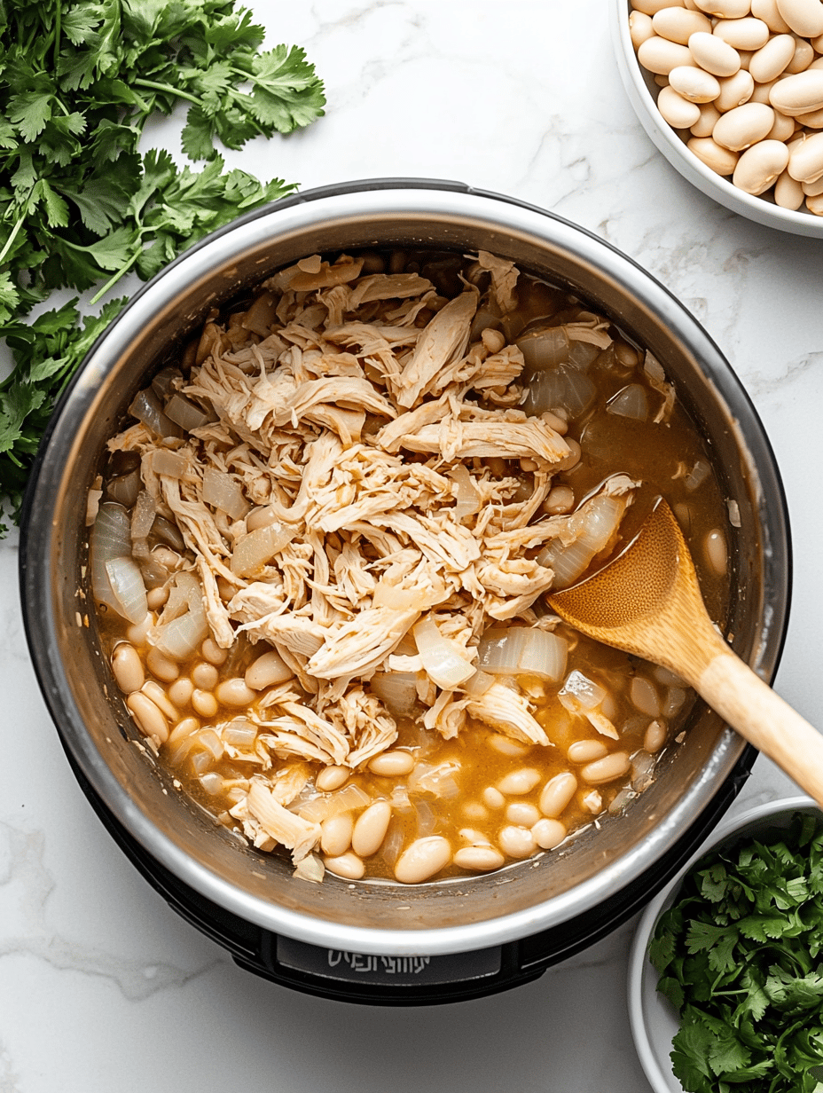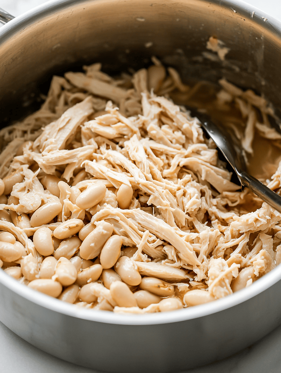 Add the shredded chicken and white beans to the pot. Stir well and cook for an additional 5 minutes to heat through.