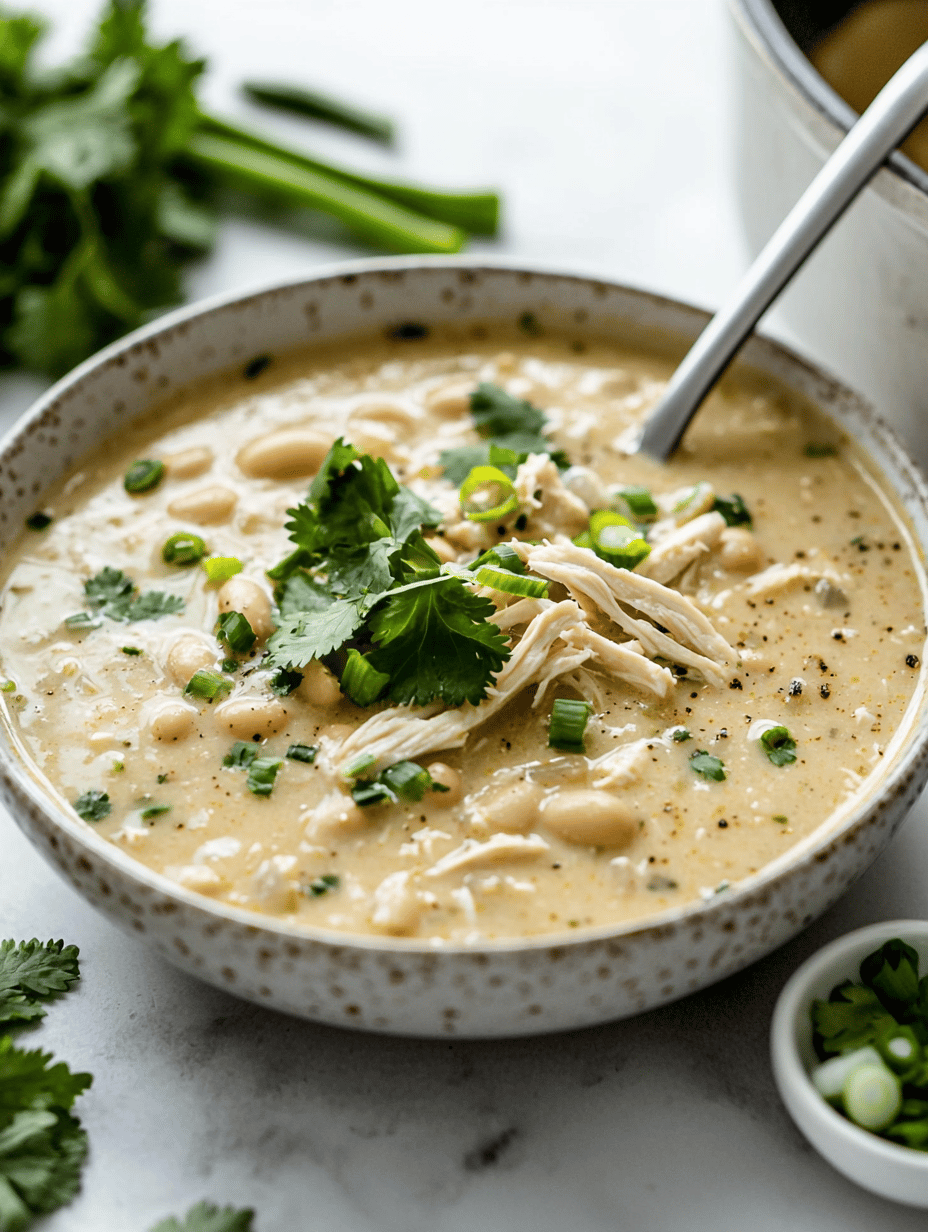 Serve the creamy white chicken chili hot, garnished with fresh cilantro or sliced green onions if you like. Enjoy its comforting, smooth texture and subtle warmth.