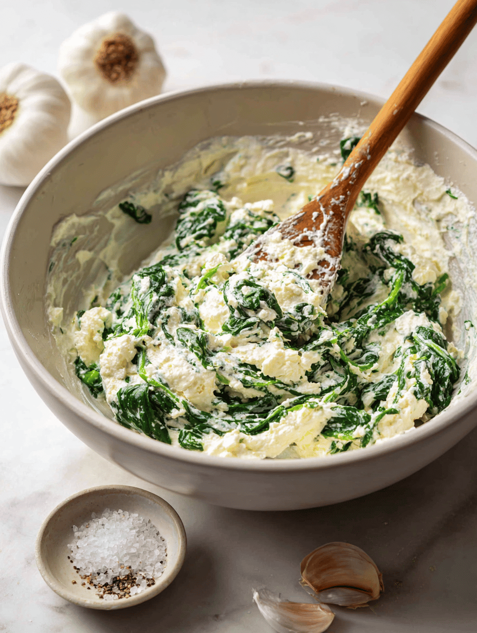 In a mixing bowl, combine ricotta cheese with the thawed and squeezed spinach, minced garlic, and a pinch of nutmeg. Season with salt and pepper, then stir until smooth and well-blended.