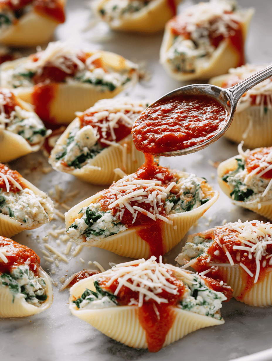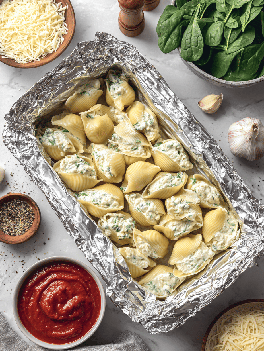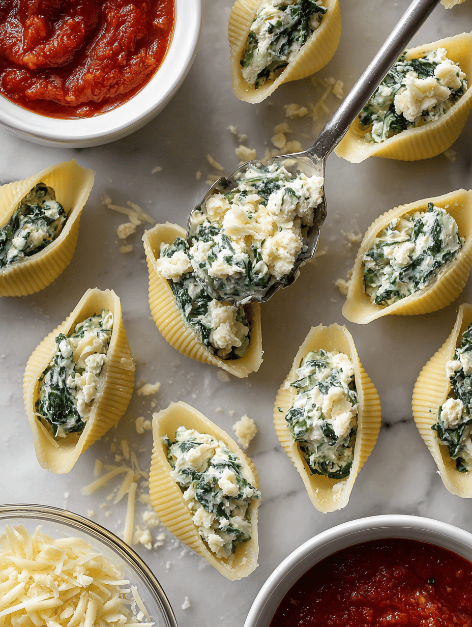 Using a spoon or piping bag, generously stuff each cooked shell with the cheesy spinach mixture, pressing gently to fill the hollow center. Arrange the filled shells in a baking dish in a single layer.