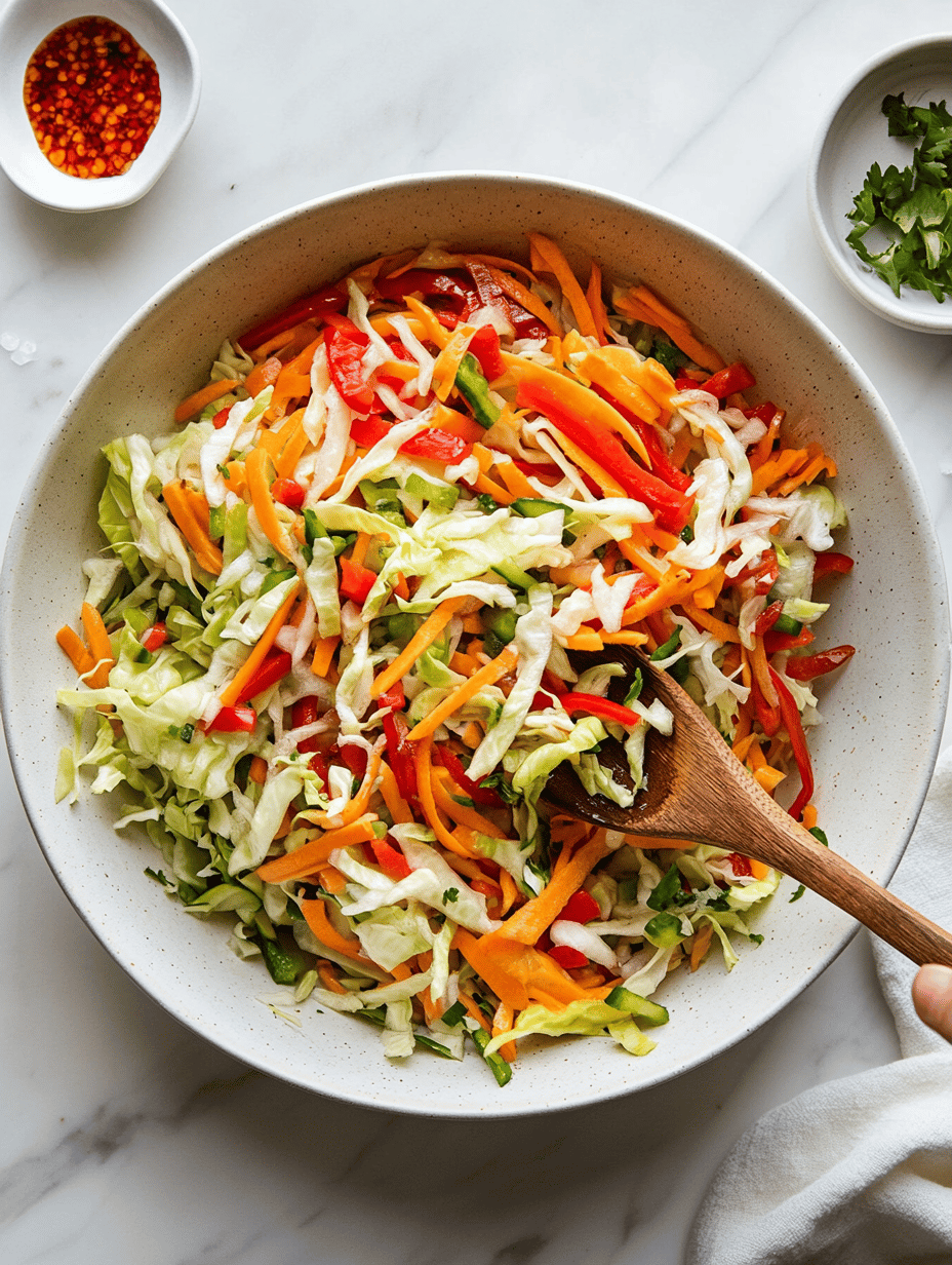 Prepare the filling: Shred cabbage and carrots and place them in a mixing bowl.