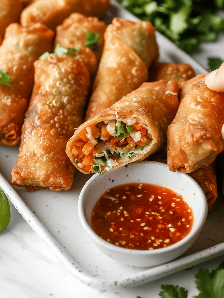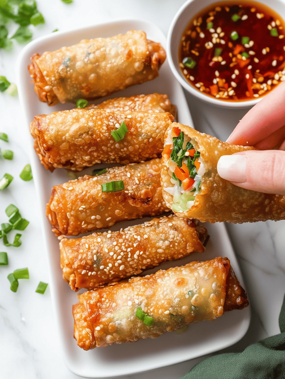 Crispy homemade egg rolls filled with a delicious mix of tender-crisp veggies and savory meat, wrapped for a satisfying crunch.