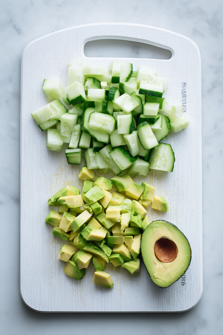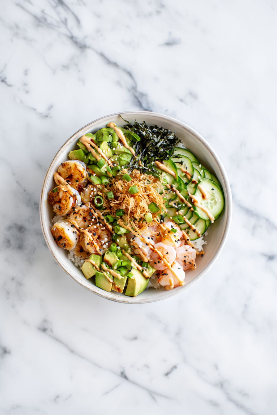 Assemble bowls with rice base, topped with shrimp, cucumbers, avocado, and seaweed snacks.