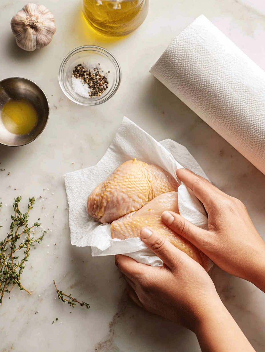 Pat the chicken thighs dry thoroughly with paper towels to remove excess moisture, which helps the skin crisp up nicely. Season generously all over with salt and pepper.