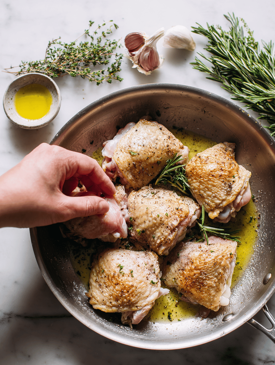Lay the chicken thighs skin-side down into the cold skillet, pressing gently to ensure full contact with the pan. Cook for about 8-10 minutes, watching the skin turn a deep, golden, crackly hue as it crisps up.