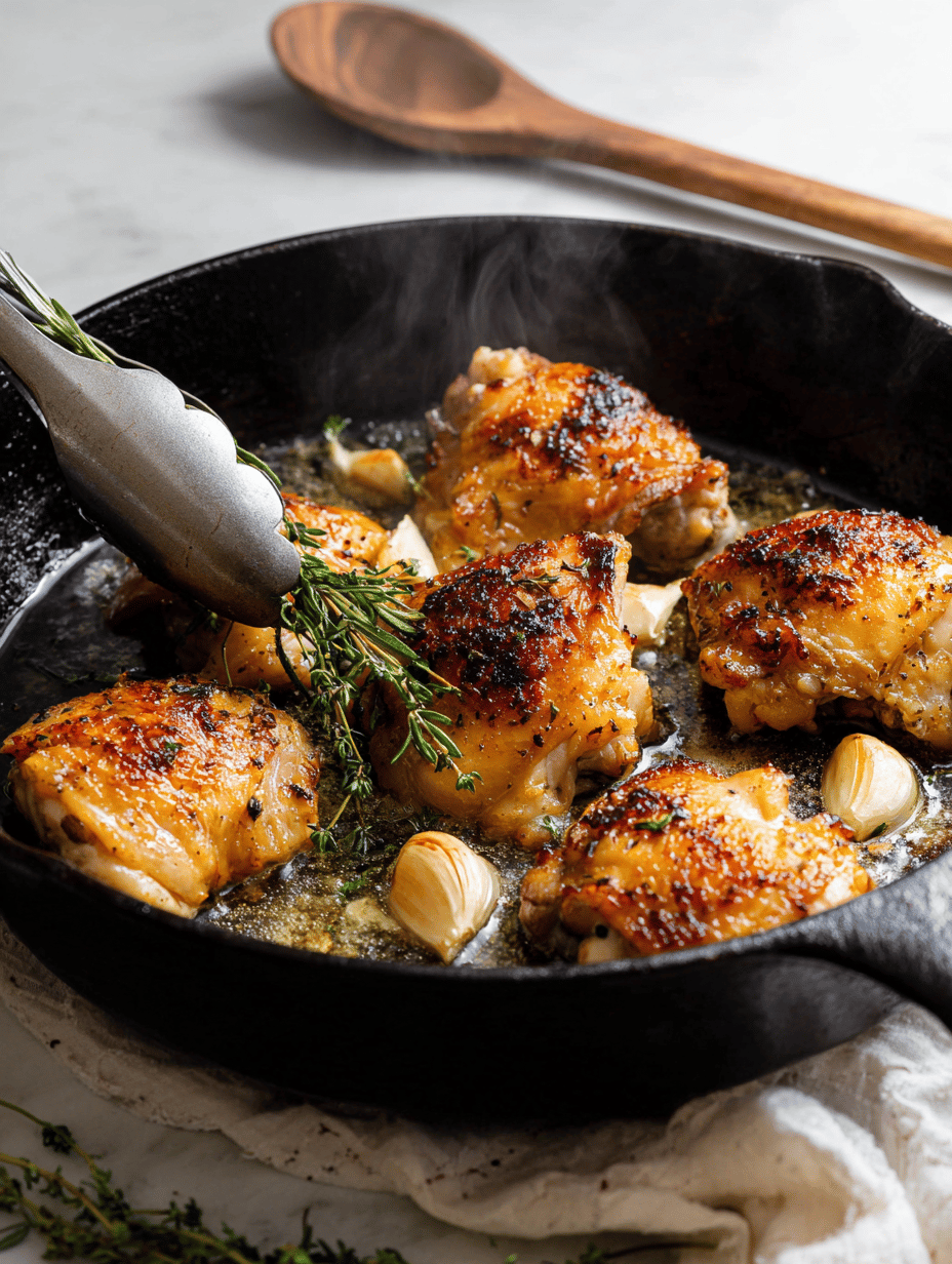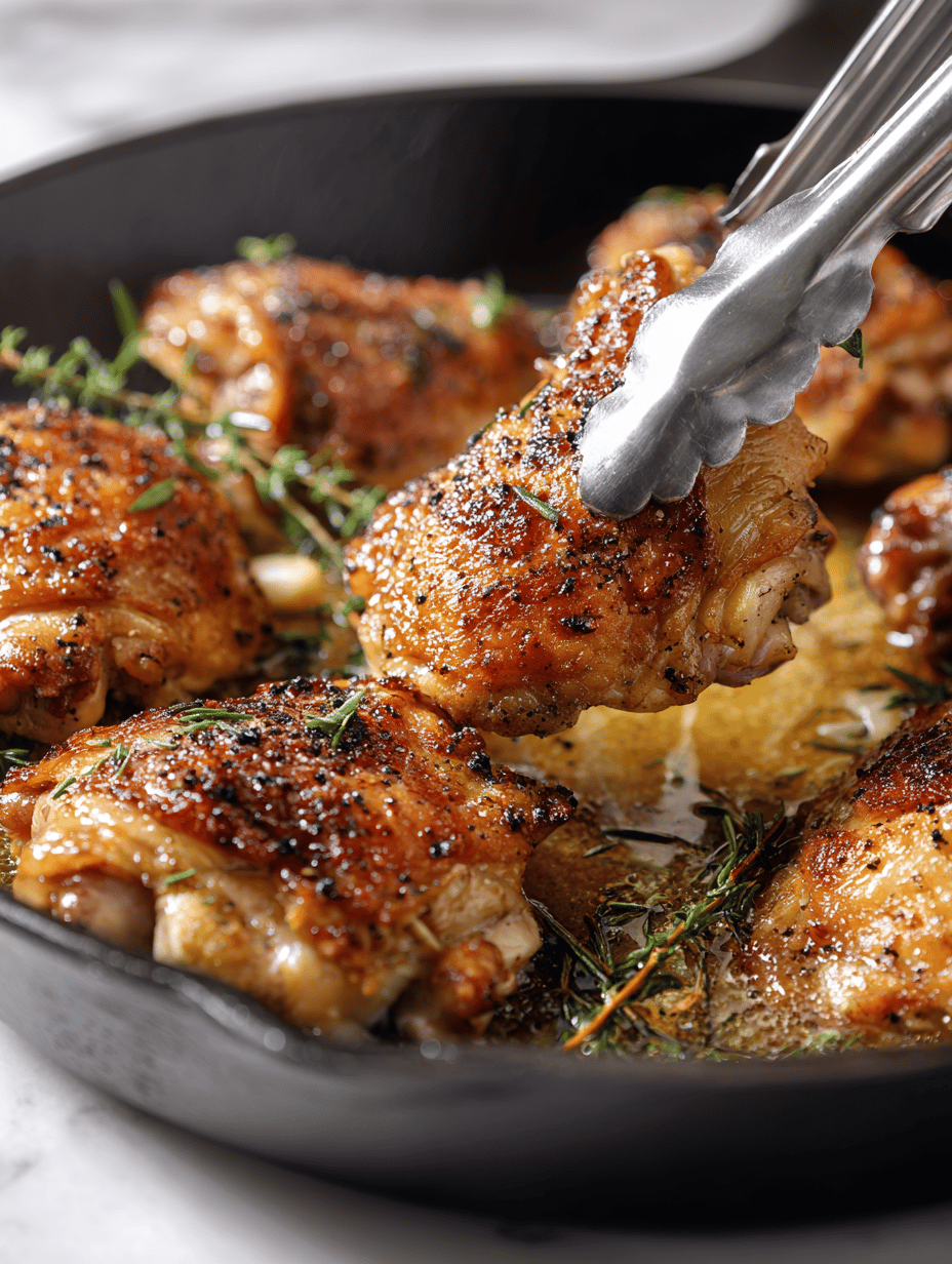Carefully flip the chicken thighs using tongs, then cook for another 8-10 minutes until the internal temperature reaches 74°C (165°F). The meat should be juicy and tender, with the skin remaining crispy.