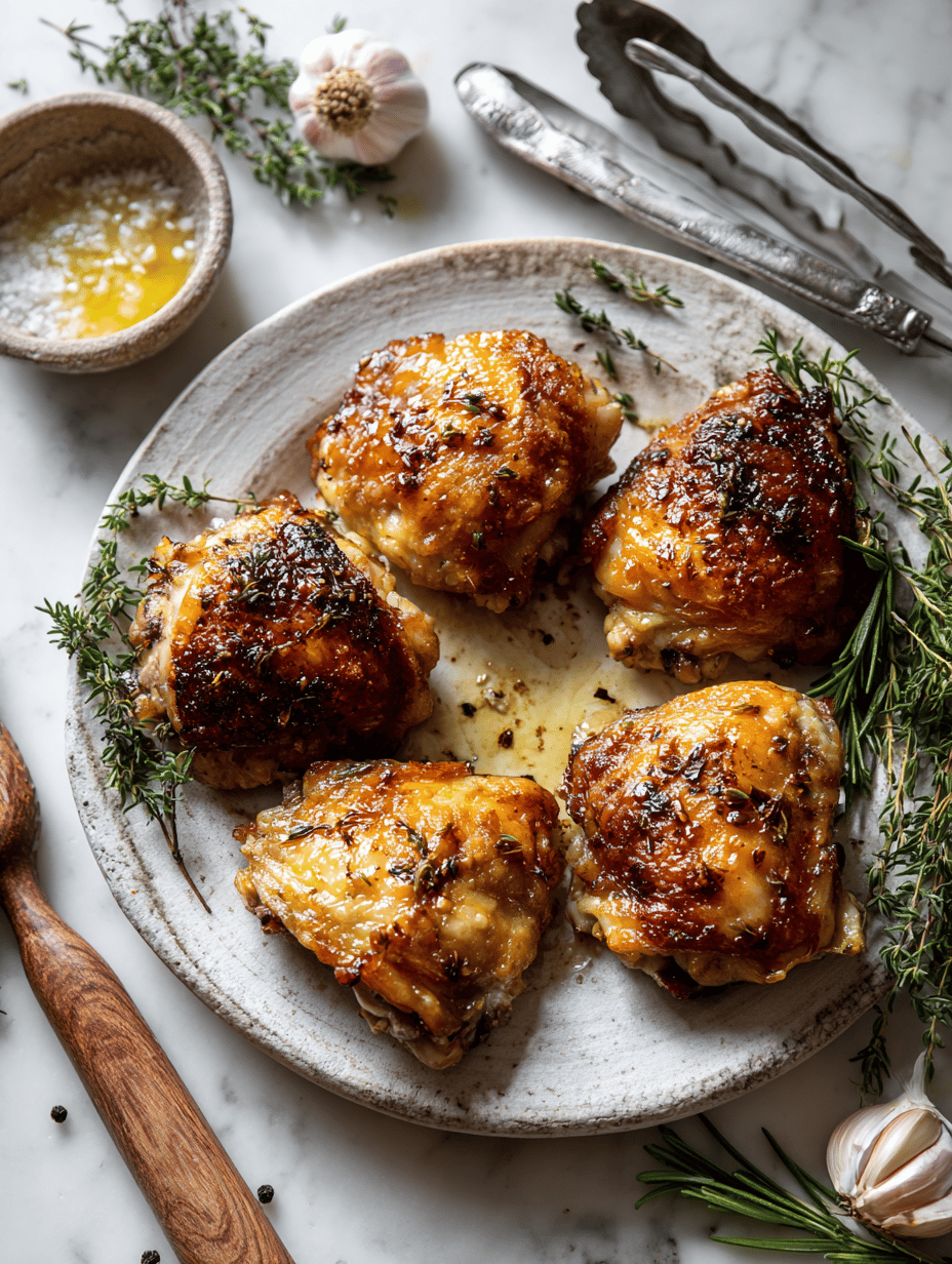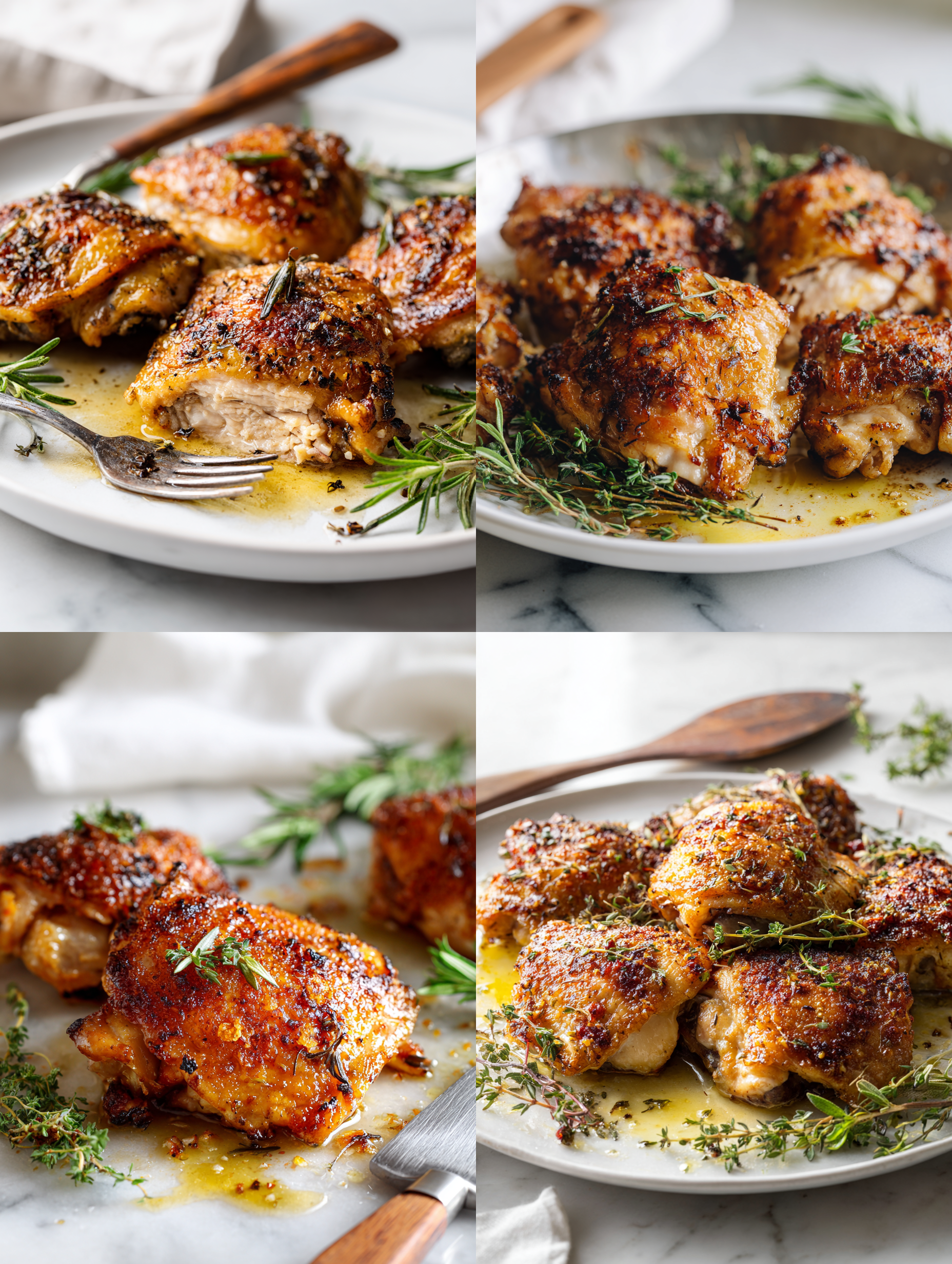 Serve the chicken thighs hot, with the crackly skin and tender meat on full display—perfect for a quick, satisfying dinner.