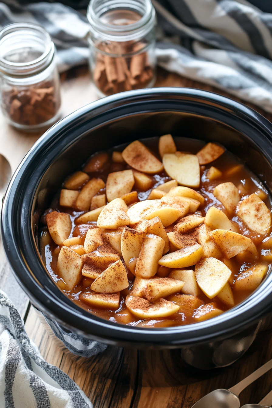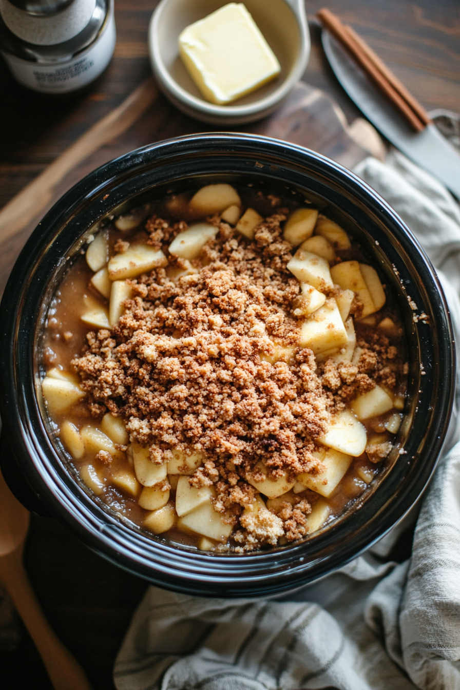 Sprinkle the crumbly mixture evenly over the apple pie filling in the crockpot.