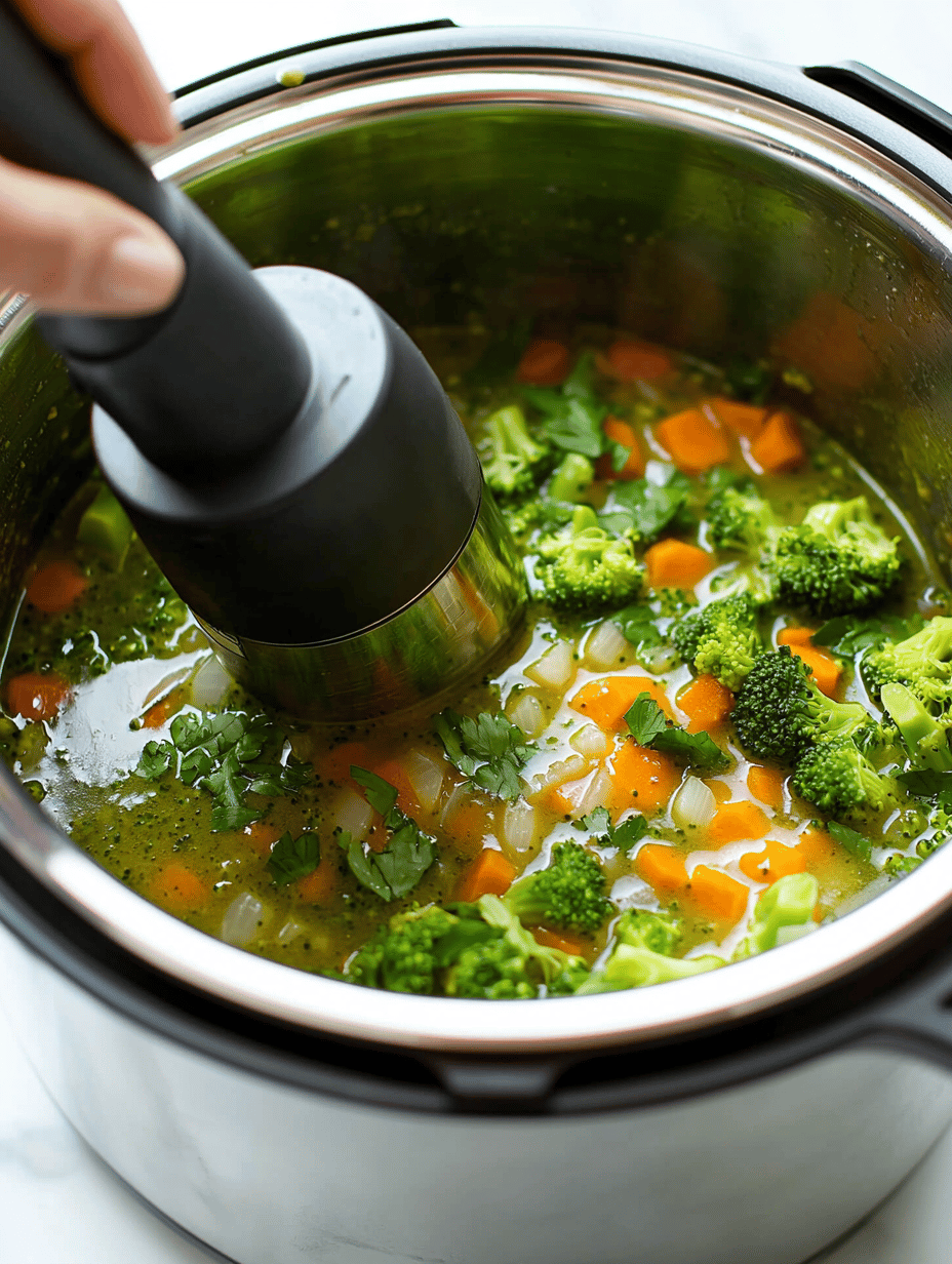 Use an immersion blender directly in the slow cooker to blend the soup until smooth and creamy, or carefully transfer to a blender in batches and blend until no lumps remain.