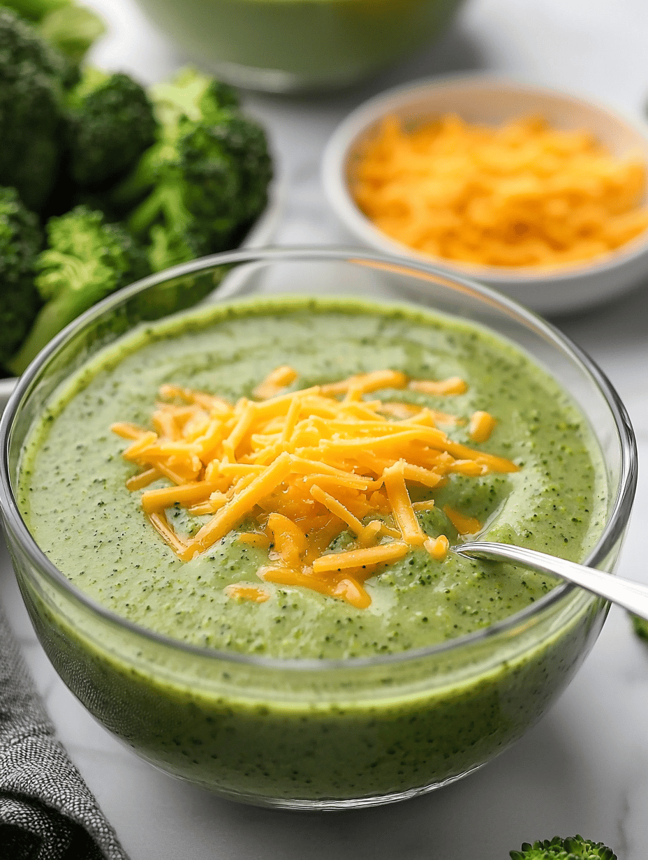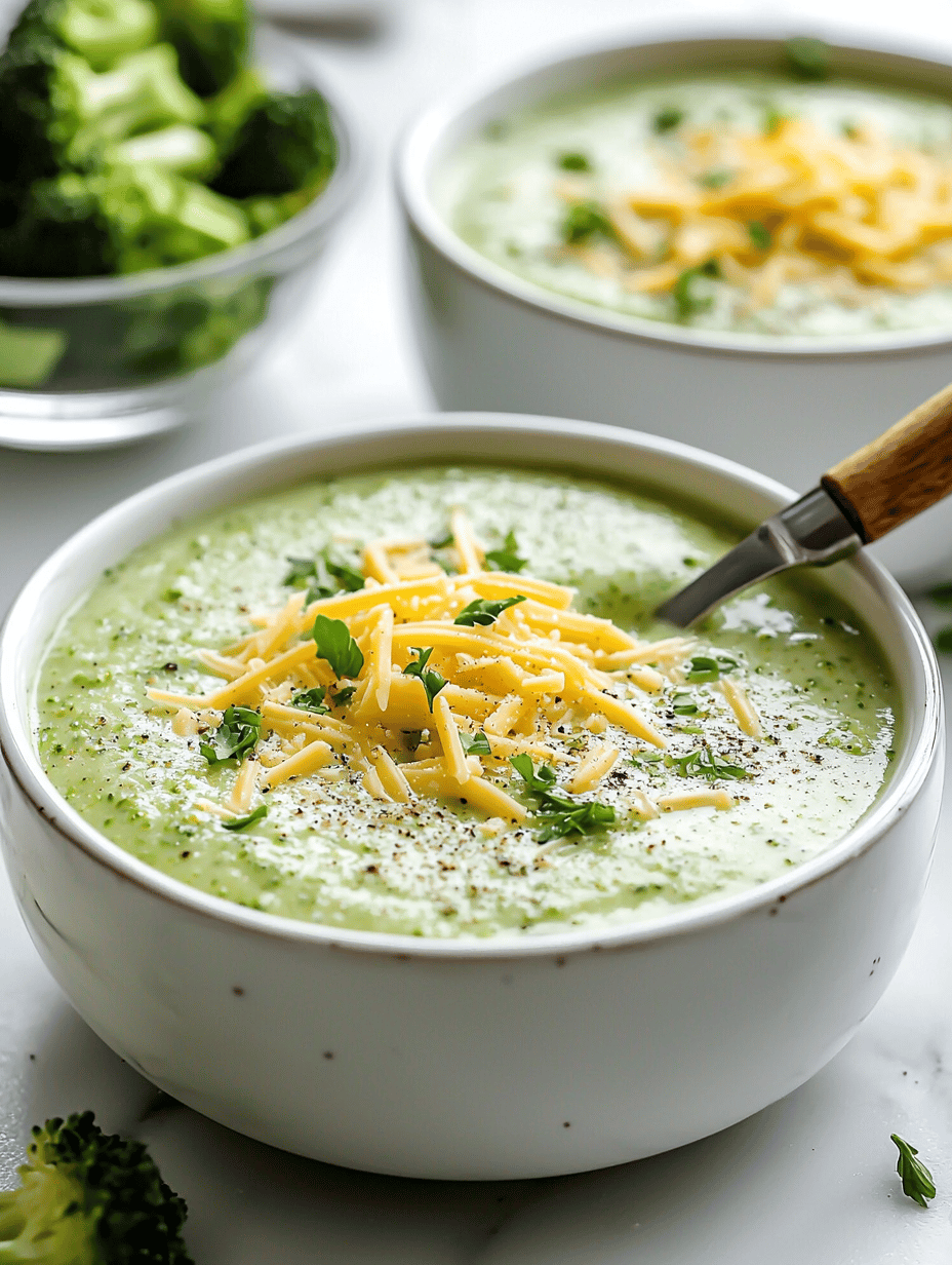 Scoop the hot, creamy broccoli soup into bowls and serve immediately, garnished with additional cheese or a sprinkle of herbs if desired.