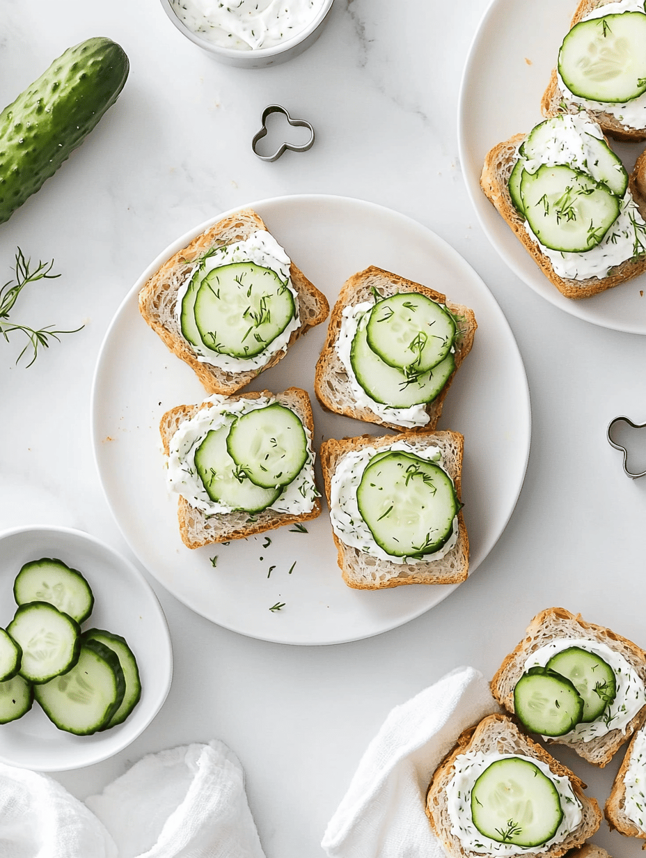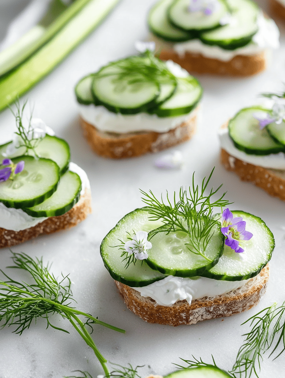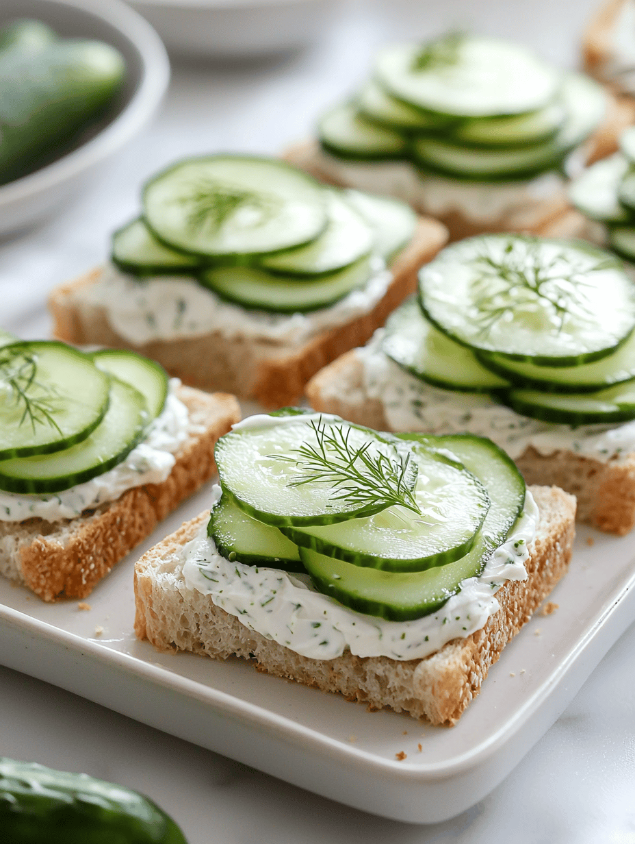 These are delicate, bite-sized tea sandwiches featuring crisp cucumber slices layered between lightly toasted bread spread with herbed cream cheese. The assembly results in crunchy, cool bites with a soft texture and a hint of herbs, perfect for an elegant tea or light gathering.