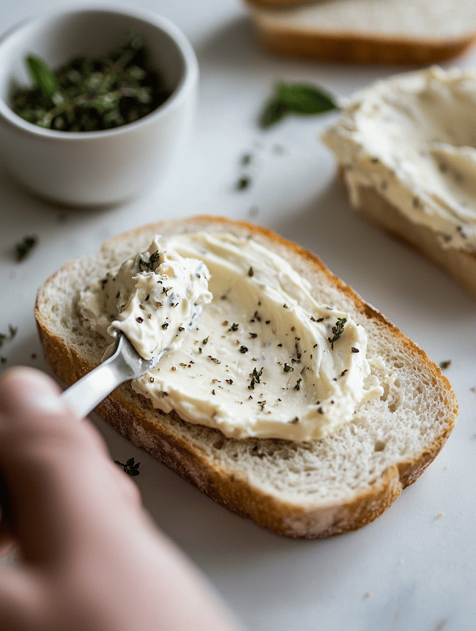 • Spread a thin layer of the herbed cream cheese evenly over each bread slice using a small spreading knife for a smooth, thin coating.