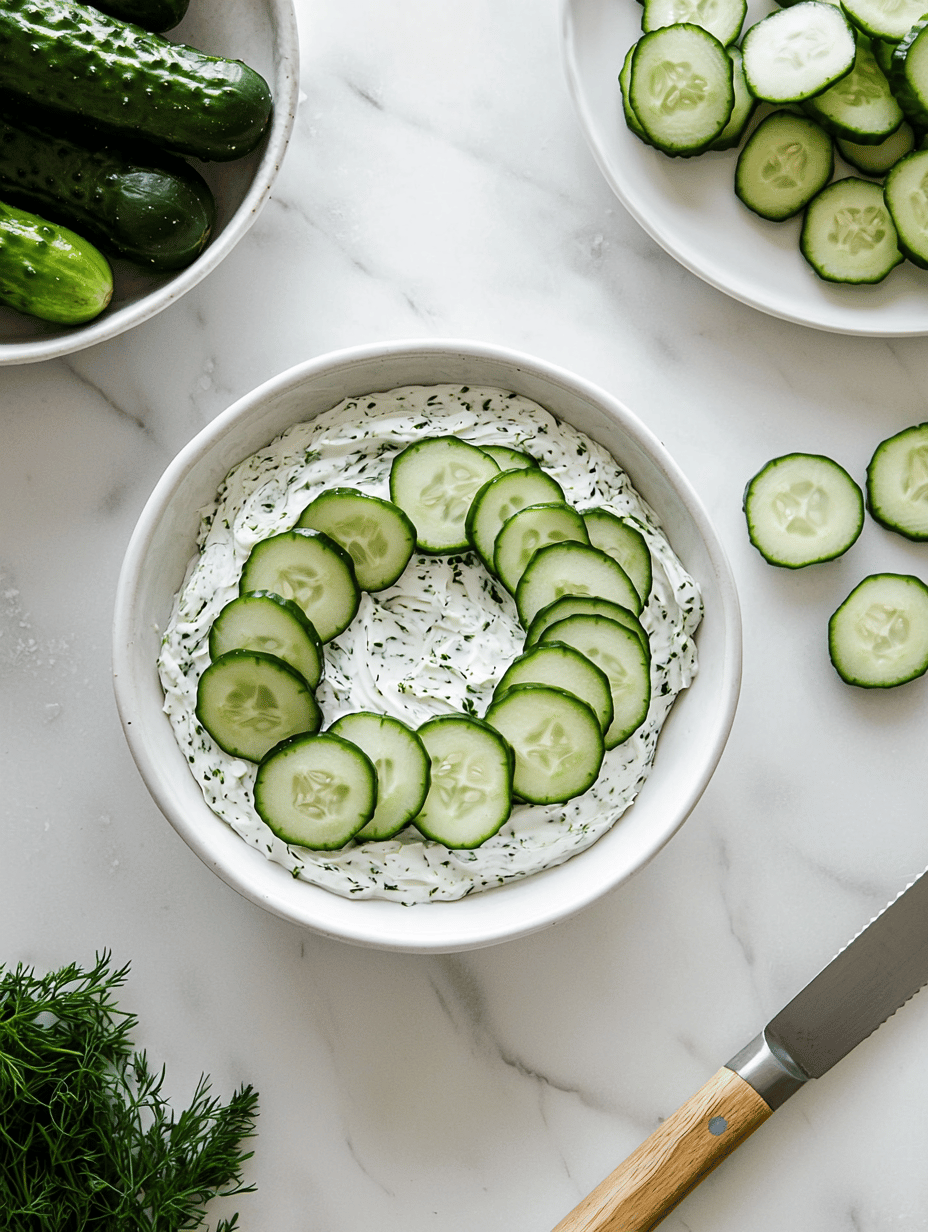 • Arrange cucumber slices in a single layer on top of the spread, slightly overlapping for full coverage but keeping the slices thin and delicate.